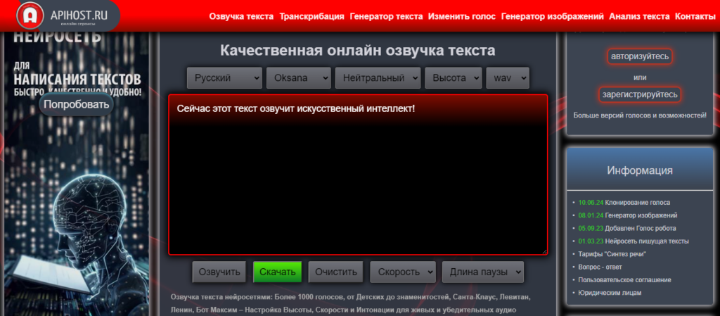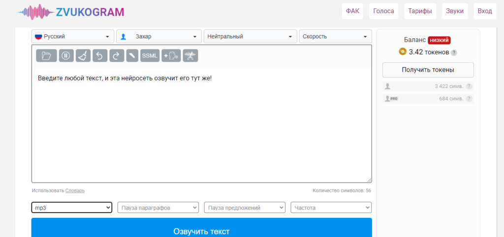 Главная | Блог | Истории | 12 лучших нейросетей для озвучки текста в 2025 году12 лучших нейросетей для озвучки текста в 2025 году 11 марта 2025 15 мин на чтение 20 Программатик нейросети Программатик нейросети Нина ОпалькоСтарший редактор Calltouch Содержание Нет времени читать? Качественная озвучка контента требует времени, ресурсов и подходящих дикторов. Но что делать, если сроки горят, а бюджет ограничен? На помощь приходит искусственный интеллект: он удешевляет создание контента. Достаточно использовать нейросеть для озвучки текста или генерации картинок, и это упростит запуск рекламных кампаний. О том, какие нейронки помогают озвучивать тексты, рассказываем ниже. А чтобы продвинуть ваш бизнес уже сейчас, не дожидаясь, пока нейросеть сделает ролик, используйте сервис Программатик. Он сам найдет ключевые площадки для вашей целевой аудитории и разместит там рекламу. А еще Программатик следит за бюджетом — у него есть фильтр площадок по CTR, фроду и конверсиям. Инстуременты CalltouchОптимизируйте контекстную рекламуВся аналитика в одном окне — от ключевого слова до лида и ROI ПодробнееNaturalReadersNaturalReaderСервис предлагает голосовых ассистентов для озвучки текстов. В базе 28 языков и диалектов. Упор делается на английский и испанский. Русский тоже есть, но два доступных ассистента — мужской и женский голоса — говорят с заметным акцентом. Есть мобильная адаптация и приложение.В настройках можно регулировать громкость, высоту и скорость голоса, управлять паузами и добавлять эффекты. Например, можно заставлять диктора шептать или менять манеру речи. Это добавляет речи естественности. Готовые аудиодорожки доступны в MP3.Преимущества:простая навигация на сайте: в раздел озвучки можно перейти в два клика;возможность настроить любой голос под индивидуальные запросы;можно загрузить документ, а ИИ его озвучит.Недостатки:нельзя оплатить с российской карты и в рублях;при озвучке на русском есть акцент;на русском доступны только два голоса: мужской и женский.OddcastOddcastСервис не просто генерирует речь из текста, но и предлагает визуализировать диктора. Вариантов настройки озвучки много: можно менять громкость, скорость речи, выразительность и высоту голоса, добавлять шепот и эхо. Еще нейросеть можно заставить говорить с эмоциями: добавить в голос злость или радость. На английском и испанском речь звучит по-человечески. На русском озвучка роботизированная. Настройки позволяют даже создавать животных, растения или неопознанных существ в качестве аватаров, которые проговаривают текст. Визуал будет сгенерирован автоматически, но его можно сменить. Преимущества:32 языка и их диалекты;простой визуал с понятными настройками несмотря на то, что интерфейс на английском;обширный выбор аватаров, включая растения, животных и невиданных существ.Недостатки:за один раз доступны максимум 600 символов текста для озвучки;это зарубежная платформа, которую можно оплатить только в долларах;всего три голоса на русском: два женских и один мужской. ZvukogramZvukogramЭто нейросеть для чтения текста, в базе которой много разных голосов и больше 100 языков, в том числе русский, 50 ассистентов. С помощью Zvukogram часто озвучивают юмористические и научные ролики на YouTube. Включены все базовые настройки голоса: его высота, скорость чтения, эмоции. Аудио можно скачать в нескольких форматах: MP3, WAV, OGG, OPUS