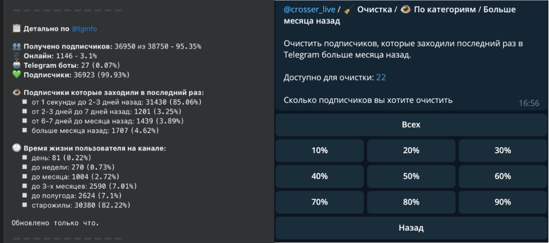 Главная | Блог | Темы | Маркетинг | Аналитика Telegram: зачем нужна, как смотреть и анализироватьАналитика Telegram: зачем нужна, как смотреть и анализировать 8 сентября 2023 18 мин на чтение 20 814 соцсети соцсети Юлия УсачеваРедактор блога Calltouch Содержание Нет времени читать? Аналитика Telegram решает проблемы, связанные с развитием каналов и чатов. Снижение активности, отписки, неэффективные рекламные объявления — часто следствие того, что владельцы каналов не используют или не умеют интерпретировать данные аналитики.Каким бы качественным ни был контент, «слепое» управление приводит к:Оттоку старых и отсутствию новых подписчиков;Снижению вовлеченности и количества взаимодействий;Большим затратам на рекламу;Упущенным возможностям роста и развития;Сложностям монетизации.Определение проблем и точек роста — первый шаг к коммерческому успеху. В этой статье — о том, какие аналитические инструменты доступны для Telegram-каналов и чатов, как их выбрать и применять.Что такое Telegram-аналитикаTelegram-аналитика — это, простыми словами, способ узнать, как подписчики взаимодействуют с каналом: сколько их, какие посты им нравятся, что им интересно читать.Поведение аудитории — самый важный фактор в развитии каналов. Она отвечает за все — охваты, эффективность рекламы, прирост и прибыль. Без понимания того, чего хочет и ждет от канала ЦА, какой контент привлекает трафик, а какой, наоборот, снижает показатели, невозможно построить работающую стратегию.Основное условие успешного продвижения — заинтересованность пользователя в продукте или информации. Только из оценки взаимодействий пользователя с контентом можно понять насколько продукт, например, курсы, одежда или просто развлекательные материалы в канале, обращается к его болям и закрывает их. Сквозная аналитикаОценивайте эффективность всех рекламных кампаний в одном окне от клика до ROIВкладывайте в ту рекламу, которая приводит клиентов ПодробнееБез детального анализа поведения и интересов аудитории канал будет переживать пики популярности, когда контент органически нравится читателям, без ровного и предсказуемого роста. Именно предсказуемость позволяет строить стратегию и улучшать показатели.Как и где смотреть аналитику в TelegramЕсть несколько способов для анализа данных:Встроенные инструменты Telegram;Боты, которые прикрепляются к каналу;Внешние сервисы — платные и бесплатные.На успех канала влияют многие показатели. Вот некоторые из них:Средний и дневной охваты, просмотры, прирост подписчиков — какие посты просматривают чаще, а какие приводят к отпискам;Качество и активность подписчиков — точно ли канал взаимодействует с целевой аудиторией или это общие нецелевые читатели;ERR — средняя вовлеченность;Индекс цитирования (CCI), количество упоминаний, репостов;Эффективность рекламных кампаний — сколько новых подписчиков пришло в канал и как они взаимодействовали с рекламным объявлением;Монетизация — взаимосвязь роста и спада прибыли с контентом и рекламными объявлениями.Подробнее о каждом показателе и метриках мы рассказали в другой статье о статистике Telegram-каналов и групп. Внутренняя аналитика TelegramTelegram предлагает внутренние инструменты аналитики. Они оценивают базовые показатели и не позволяют сделать глубокий анализ. Основной плюс — простота использования. Для просмотра показателей не