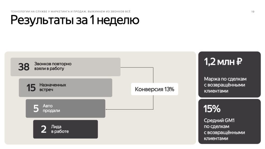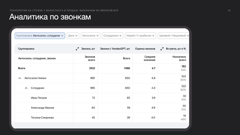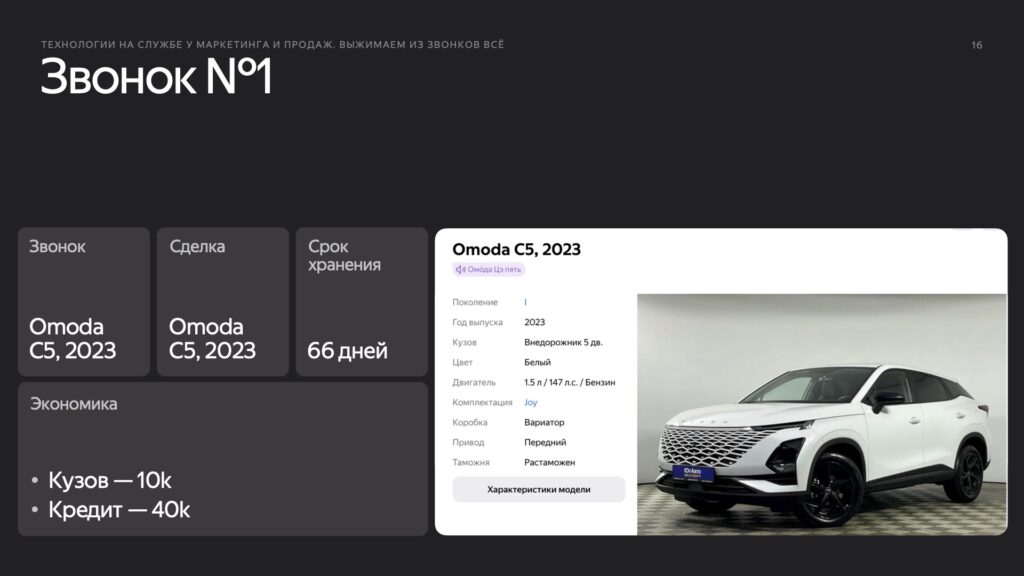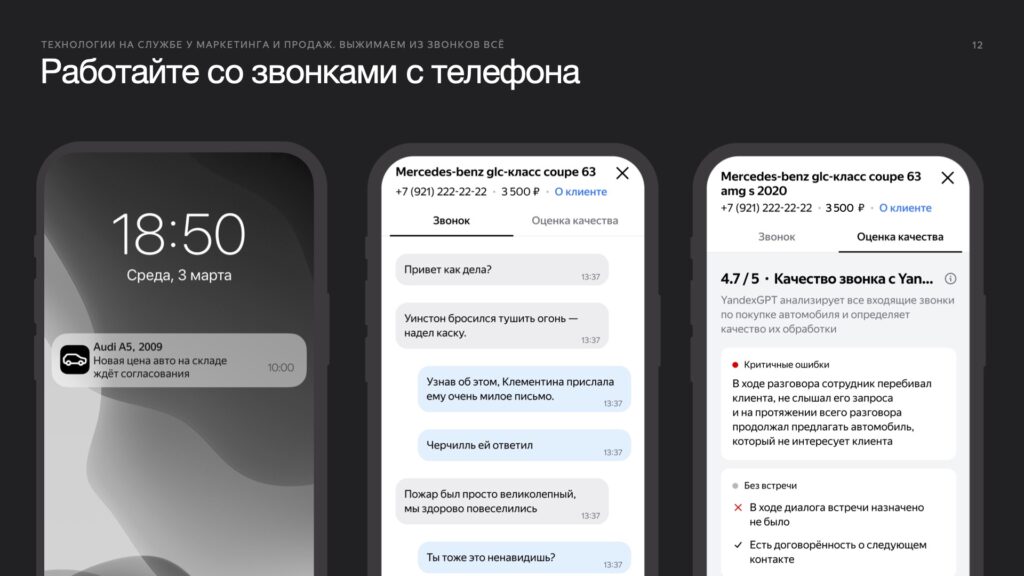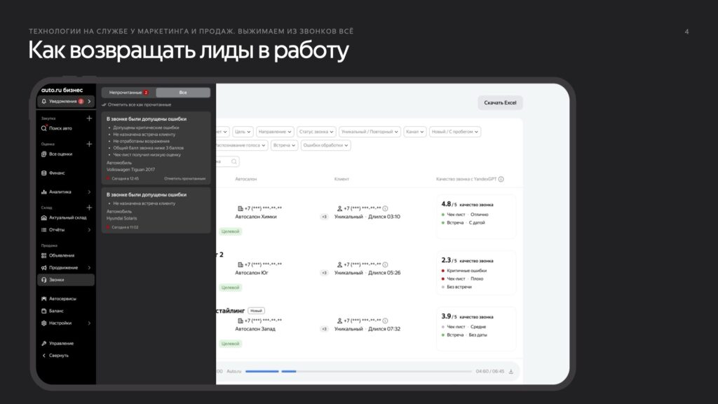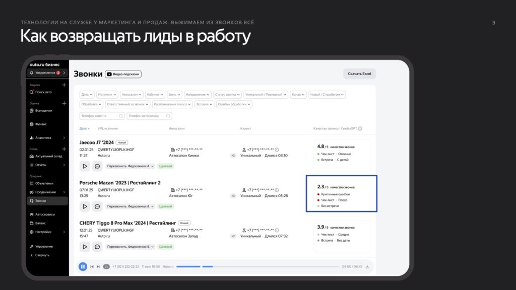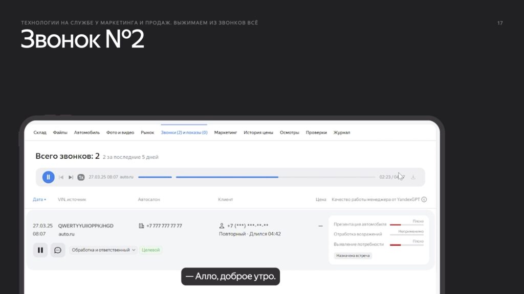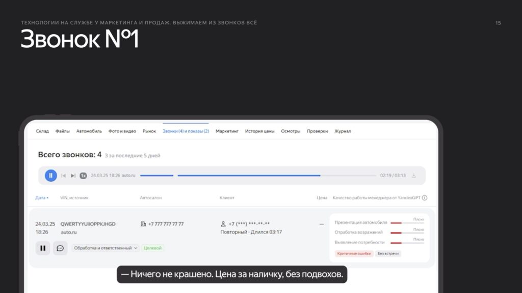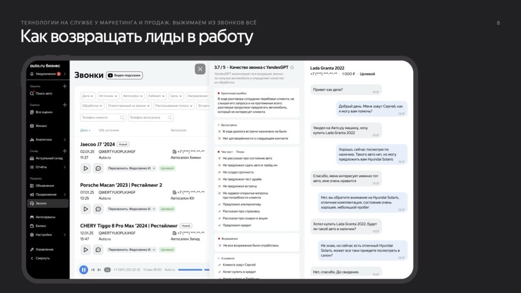 Главная | Блог | Мероприятия | Анализ качества звонков в новом кузове: как в автоиндустрии повышать конверсию из лида в продажу с помощью ИИ-технологий. Кейс Авто.ру БизнесАнализ качества звонков в новом кузове: как в автоиндустрии повышать конверсию из лида в продажу с помощью ИИ-технологий. Кейс Авто.ру Бизнес 31 октября 2025 9 мин на чтение 66 Нина ОпалькоСтарший редактор Calltouch Содержание Нет времени читать? Автосалонам и ДЦ больше не надо тратить по 20 часов в день для прослушивания звонков колл-центра. Для решения проблем с низкой конверсией из звонка в продажу автомобиля достаточно лишь одного инструмента. Какого — расскажем в нашей статье.В 2024 году в Авто.ру Бизнес появился инструмент на базе нейросети Яндекса Alice AI (прежнее название — YandexGPT), который помогает анализировать качество входящих лидов. А в 2025 году компания выпустила усовершенствованную его версию.О преимуществах использования ИИ-помощника в работе рассказала Менеджер продукта Авто.ру Бизнес Екатерина Волошина. Эффективность инструмента она продемонстрировала реальными кейсами на ежегодной конференции о привлечении, конверсии и аналитике в индустрии авто Callday.Auto 2025. Возможность получать уведомления о звонках с ошибками в режиме реального времениВы можете настроить получение уведомлений о тех ошибках, которые важны именно вам: это могут быть звонки с критичными ошибками, в которых менеджер не назначил встречу или не отработал возражения. Модель ИИ-технологии Авто.ру Бизнес анализирует абсолютно все входящие звонки в дилерский центр: как по автомобилям с пробегом, так и по новым авто.Строка с проблемным звонкомУведомление о звонкеИз каких параметров состоит анализ качества звонковналичие критичных ошибок — грубость сотрудника, отсутствие инициативы или игнорирование запроса клиента;была ли назначена встреча в автосалоне — одна из ключевых задач менеджера назначить встречу и сделать все возможное, чтобы клиент доехал до автосалона;назначение встречи с конкретной датой и временем — новая доработка интерфейса по просьбам руководителей автосалонов;договоренность о следующем контакте — ведь не всегда получается назначить встречу, но если сотрудник согласовал следующую коммуникацию, то лид нельзя считать упущенным;создавал ли сотрудник срочность; предложил ли альтернативные варианты автомобилей, когда это требовалось;задавал ли открытые вопросы для выявления потребностей;насколько хорошо менеджер отработал возражения. Руководители могут получать уведомления о звонках, в которых возражения не были отработаны, и возвращать их в работу. Детализация проблем по звонкуВ интерфейс добавили основные знания о клиентах:хочет ли клиент купить авто в кредит;есть ли у него автомобиль, который он готов сдать в трейд-ин;срочная ли это покупка.Эти данные нужны, чтобы в дальнейшем упрощать работу компаниям. Фильтры помогают найти клиентов, для которых покупка срочная, и возвращать их в работу, если качество звонка было низким. Также можно находить тех, кому покупка нужна в кредит, если в ДЦ не выполнен план по кредитам.Звонки удобнее читать, а не слушатьТехнология Авто.ру Бизнес преобразует аудио в текстовую расшифровку, что значительно экономит время сотрудников отдела контроля качества и сокращает интервал времени до повторного взаимодействия с клиентом.Ве