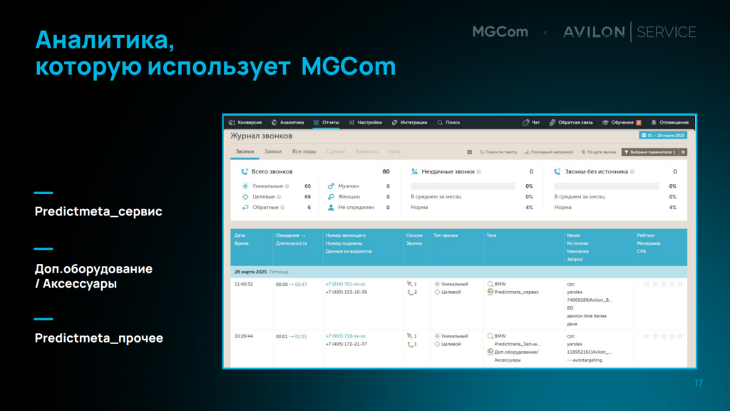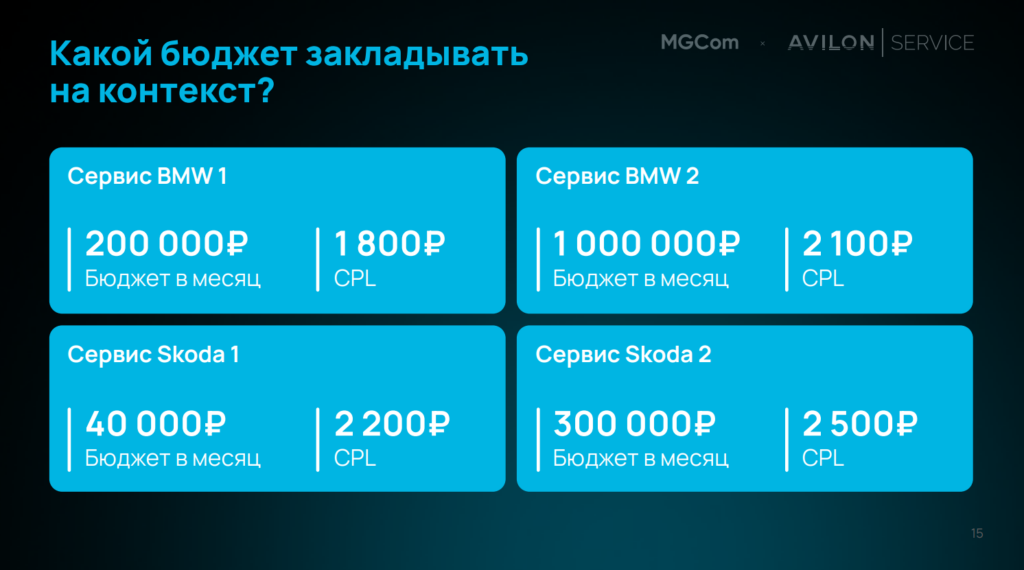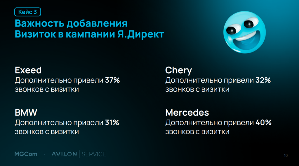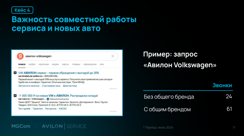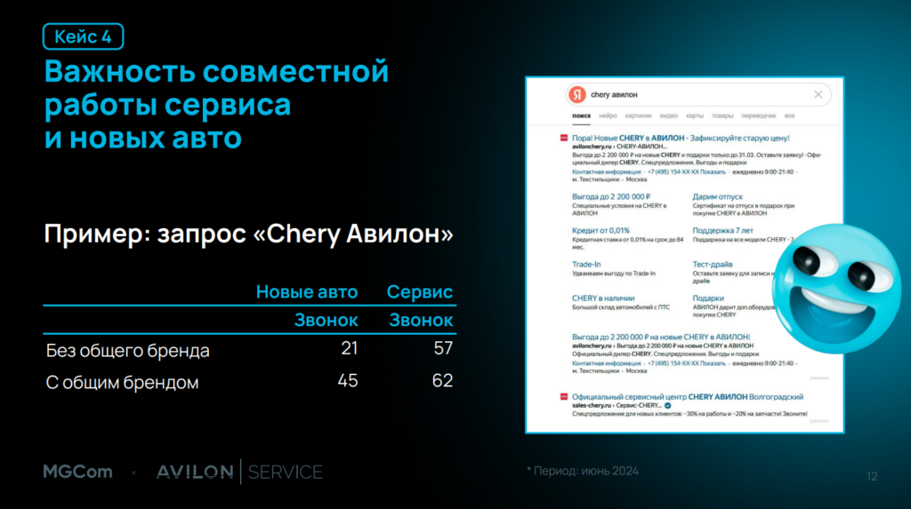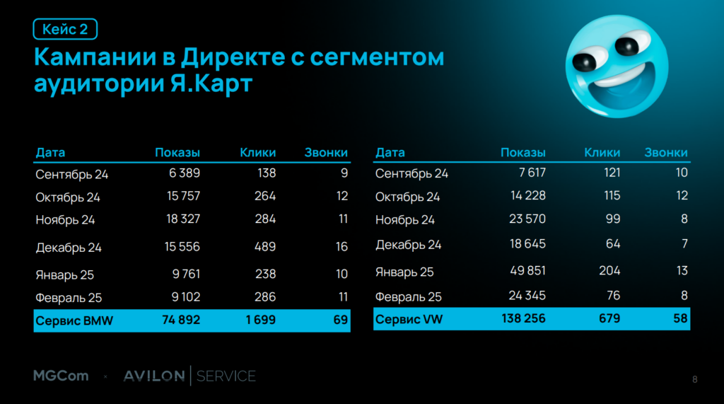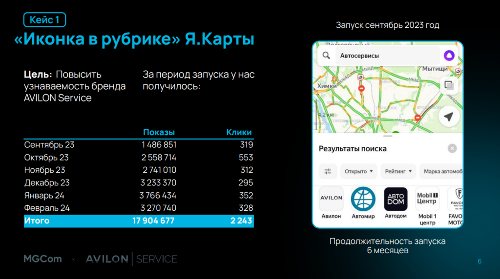Главная | Блог | Мероприятия | AVILON ⨯ MGCom: 5 кейсов, которые вдохновят автобизнес на маркетинговые экспериментыAVILON ⨯ MGCom: 5 кейсов, которые вдохновят автобизнес на маркетинговые эксперименты 6 ноября 2025 22 мин на чтение 28 сквозная аналитика сквозная аналитика Нина ОпалькоСтарший редактор Calltouch Содержание Нет времени читать? Рынок послепродажного обслуживания автомобилей в России серьезно изменился вслед за автомобильным рынком. Уход европейских брендов, рост доли китайских марок, снижение лояльности клиентов — всё это до сих пор требует новых решений. В 2023 году маркетологи AVILON Service поняли: прежние подходы в маркетинге уже не работают так, как раньше. Вместе с digital-агентством MGCom компания решила провести серию маркетинговых экспериментов — протестировать разные рекламные каналы, аудитории и инструменты, чтобы найти рабочие форматы продвижения и привлечь больше клиентов в сервис. О том, что сработало, а что — нет, на конференции Callday.Auto 2025 рассказали Анастасия Мотрич, руководитель отдел маркетинга и рекламы подразделения Сервис группы компаний «АВИЛОН», и Антонина Мунтян, менеджер по работе с клиентами MGCom.О компанииДанные о партнерахAVILON — один из крупнейших автомобильных холдингов в России с более чем 28-летней историей на рынке. Сегодня компания предлагает практически все основные автомобильные бренды, доступные в стране — всего в ассортименте более 70 марок. Послепродажное обслуживание занимает важное место в структуре бизнеса: в распоряжении компании 2 кузовных цеха и более 10 механических, расположенных в 4 локациях в Москве.Для продвижения этого направления был привлечен партнер — digital-агентство MGCom. Оно взяло на себя непростую задачу: выстроить маркетинговую работу в сфере послепродажного обслуживания. Это сложная, многозадачная работа, требующая постоянного контроля и гибкого подхода.За 22 месяца партнерства было запущено более 50 проектов и протестировано свыше 150 гипотез в разных каналах и форматах. Часть из них показала отличные результаты, другие помогли сделать важные выводы. В любом случае, этот опыт стал основой для понимания того, что действительно работает в продвижении сервиса, а что — нет.Кейс №1. Иконка на Яндекс Картах: 18 млн показов, ноль звонковЭтот кейс стал для команды первым экспериментом. Решили начать с простого и, на первый взгляд, логичного шага — размещения на Яндекс Картах. Логика проста: этими картами пользуются практически все, и особенно часто автомобилисты, которые являются целевой аудиторией AVILON Service. Поэтому задача была четкой: показать бренд именно тем, кто регулярно ездит, ищет маршруты и видит автосервисы на карте.Цель размещения — повысить узнаваемость бренда среди владельцев автомобилей и, по возможности, получить первые обращения. Хотелось понять, даст ли эта иконка хоть какие-то «следы»: клики, интерес, запросы, звонки.Что сделалиБюджет составлял около 90 000 рублей в месяц, размещение длилось 6 месяцев. Этого срока было достаточно, чтобы собрать статистику и сделать выводы.Что получилиПолучилось добиться почти 18 миллионов показов и получить 2 243 клика.Статистика первого экспериментаКазалось бы, хорошие цифры. Но что с узнаваемостью бренда? Если посмотреть на данные по количеству запросов бренда до запуска, во время кампании и после нее, станет понятно: статистика практически не изм