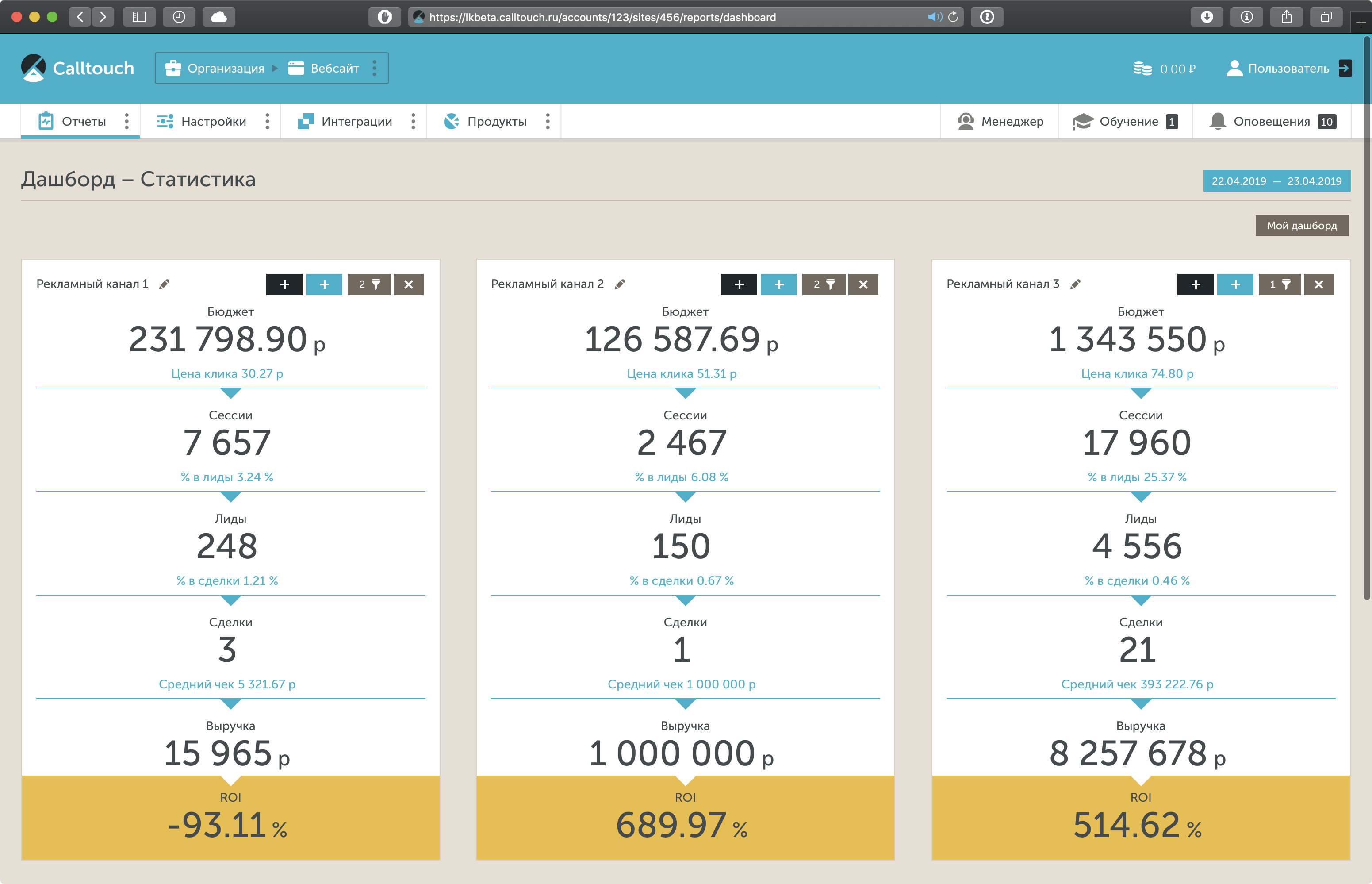 Главная | Блог | Продукты Calltouch | CRM от Calltouch: маркетинг и продажи в одном интерфейсеCRM от Calltouch: маркетинг и продажи в одном интерфейсе 25 апреля 2019 6 мин на чтение 7 680 сквозная аналитика CRM сквозная аналитика CRM Алексей ФилимоновРуководитель отдела сквозной аналитики Calltouch Содержание Нет времени читать? Продакт-менеджер Алексей Филимонов рассказывает о новинке апреля, которая порадует всех пользователей Calltouch без исключения – теперь в личном кабинете доступна мини-CRM. Как использовать, что входит и кому будет полезна – в статье.Начнем с отличий. В «больших» CRM-системы, вроде amoCRM, можно максимально детально настроить этапы продаж. Вы полностью отслеживаете воронку, меняете этапы – конечно, ведь она создана для того, чтобы контролировать продажи. Тем не менее, небольшому бизнесу на первых парах не нужен весь функционал. Либо нужен, но пока не принято решение какую из многочисленных CRM предложенных рынком использовать. Что делать, если хочется сэкономить бюджет, но контролировать маркетинг и продажи? Подключить Calltouch c мини-CRM внутри личного кабинета.CRM Calltouch бесплатно доступна на всех тарифах, разберем на примере Старт+. Вы – малый бизнес, однако уже точно знаете, что нужно отслеживать бюджет на рекламу и ее выхлоп. Тем не менее, выделить бюджет на аналитику и CRM одновременно не выходит. Более того, переплачивать за полный функционал CRM-системы вы не хотите – он вам попросту еще не нужен. Вы подключаете Calltouch. В одном интерфейсе вы одновременно отслеживаете рекламу и там же видите данные по сделкам – сколько продаж было, сколько потратили на рекламу. Данные по маркетингу и продажам собираются автоматически и в одном месте. Профит. О чем обновлениеВ мини-CRM включены основные возможности управления продажами. Более того, в отличие от других CRM, в Calltouch теперь в одном интерфейсе можно отслеживать, сколько потрачено на рекламу, количество лидов и сколько пришло сделок. Другими словами, видно, сколько вы вложили и сколько получили от этого прибыли.Интеграция с системами рекламы и CRM – настоящая головная боль маркетологов. Увы, в большинстве систем такого функционала просто нет. А в тех, которые подразумевают подобного рода решение, оно оказывается максимально сложным в реализации.Очевидно, что должен был настать день, когда сервис, занимающийся сквозной аналитикой создаст внутренний софт по управлению продажами. И он настал. Сквозная аналитикаОценивайте эффективность всех рекламных кампаний в одном окне от клика до ROIВкладывайте в ту рекламу, которая приводит клиентов ПодробнееМаленькая CRM с большими возможностямиСейчас CRM Calltouch представляет из себя вот такой блок.Он отображается в журналах звонков, заявок и лидов.Кликнув по любому звонку или заявке, вы можете добавить сделку. Это не займет больше десяти секунд – раз-два и готово. Введите имя менеджера, статус сделки, выручку и произвольный комментарий, например, «Отправить КП».Обратите внимание, если вы добавляете сделку текущей датой, в отчетах «ROI» или «Дашборд» она появится на следующий день, так как в Calltouch эти отчеты строятся за прошлый день. Это необходимо для того, чтобы подгрузить данные из рекламных систем. Если вы создаете сделку за прошедшие дни, то информация отображается сразу же.У одной заявки может быть оформлено несколько сделок, а также сделки могут тегироваться как и звон