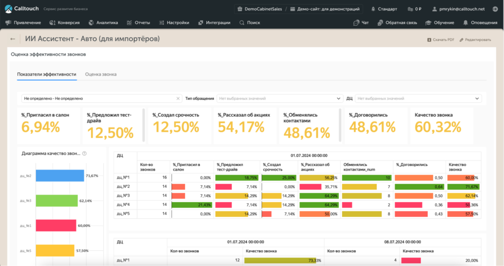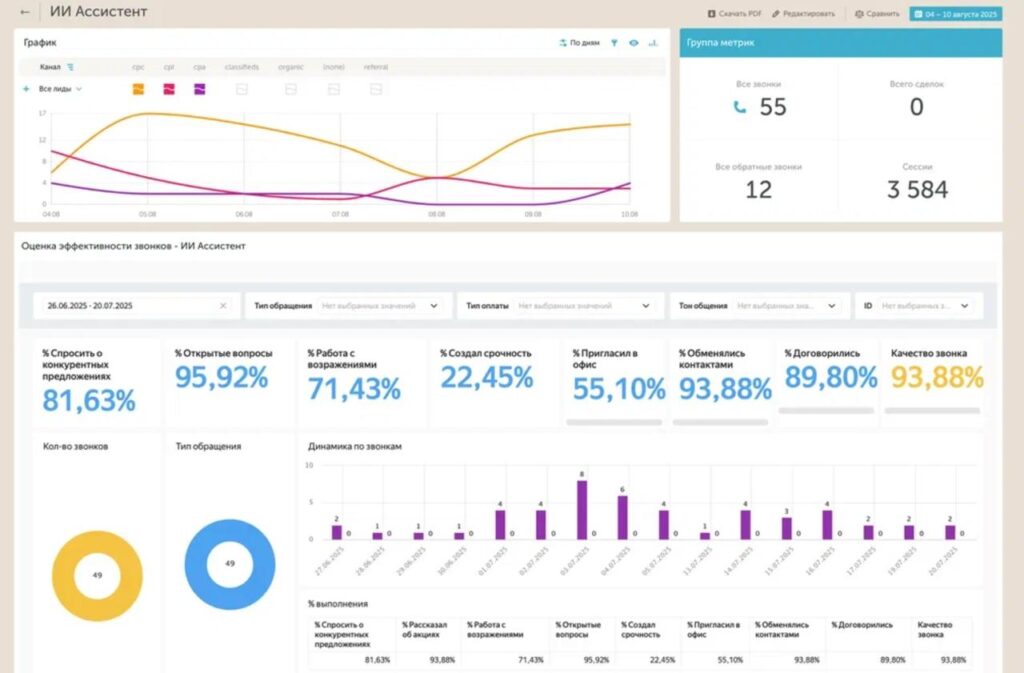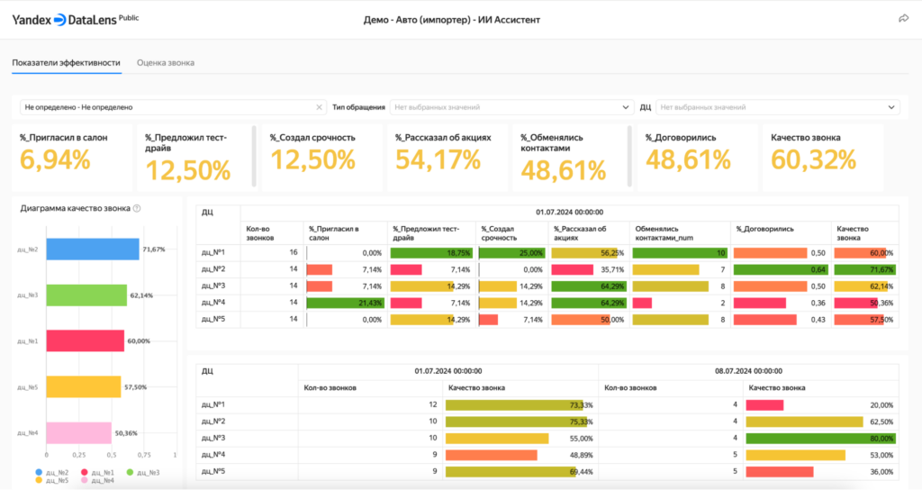 Главная | Блог | Продукты Calltouch | Новые продукты | Импорт дашбордов DataLens в кабинет Calltouch. Новые возможности для ИИ Ассистента и не толькоИмпорт дашбордов DataLens в кабинет Calltouch. Новые возможности для ИИ Ассистента и не только 22 сентября 2025 6 мин на чтение 368 интеграции ИИ Ассистент аналитика Calltouch интеграции ИИ Ассистент аналитика Calltouch Дарья МаклыгинаКопирайтер Calltouch Содержание Нет времени читать? ИИ Ассистенту уже второй год. С самого старта продукта мы старались делать его максимально гибким для наших клиентов. Мы стремились соблюсти баланс между скоростью запуска и гибкостью отчётности, поэтому с самого начала начали использовать альтернативные BI-системы для построения отчётности.Что такое ИИ Ассистент?Это продукт, который прослушивает звонки за маркетолога, руководителя отдела продаж, контролера качества и определяет их успешность. Оценивать звонки можно по нашему чек-листу или составить свой. А чтобы погрузиться в аналитику по звонкам глубже, есть аналитические отчёты ИИ Ассистента в DataLens. DataLens — это BI-система для визуализации и анализа данных, которая позволяет создавать графики или дашборды на основе множества данных. Раньше дашборды по ИИ Ассистенту можно было просматривать только в личном кабинете DataLens. Для работы со звонками приходилось использовать два разных кабинета, а ссылки на отчётность в DataLens иногда терялись. Сегодня мы импортировали дашборды DataLens прямо в личный кабинет Calltouch. Теперь всю статистику можно посмотреть в одном окне.Как это выглядит в кабинете CalltouchПочему понадобились доработкиМы постоянно работаем над тем, чтобы сделать продукты качественнее и удобнее в использовании. Для этого мы собираем обратную связь от клиентов. И в случае с интеграцией DataLens поступили так же. Вот какие проблемы мы выделили:Клиентам бывает сложно найти приглашение в «организацию», чтобы принять его.Нужно постоянно отслеживать выдачу прав — они приходят на личные почты сотрудников.Приходится переключаться между несколькими окнами и заводить дополнительную учетную запись для входа.Именно поэтому мы решили вшить дашборды DataLens в личный кабинет Calltouch — это решает все три проблемы клиентов, с которыми они сталкивались чаще всего. ИИ Ассистент CalltouchУстали от спора между маркетингом и продажами? ИИ Ассистент возьмет на себя роль арбитра:Точно квалифицирует звонокОценит обработку лида менеджеромНемедленно сообщит вам о потере потенциально целевого лидаДаст возможность вернуть клиента на линию продаж в течение 30 минут ПодробнееКакой профит вы получаетеПриватные дашборды. Если в личном кабинете Calltouch работают несколько сотрудников, дашборды DataLens смогут открыть только те сотрудники, у которых есть доступ к ним. Приватный дашборд нельзя забрать через код страницы, т.к. токен доступа генерируется на стороне серверов Calltouch.Встраивание приватных дашбордов доступно только на тарифе Business DataLens.Возможность встроить публичный чарт/дашборд. Если у вас есть доступ к публичным дашбордам с данными, которые не содержат коммерческую тайну, то вы можете по ссылке встроить их в кабинет Calltouch. Сквозная аналитикаОценивайте эффективность всех рекламных кампаний в одном окне от клика до ROIВкладывайте в ту рекламу, которая приводит клиентов ПодробнееВозможность в одном дашборде отобразить данные из DataLens и Calltouch. Выводите данные по всем з