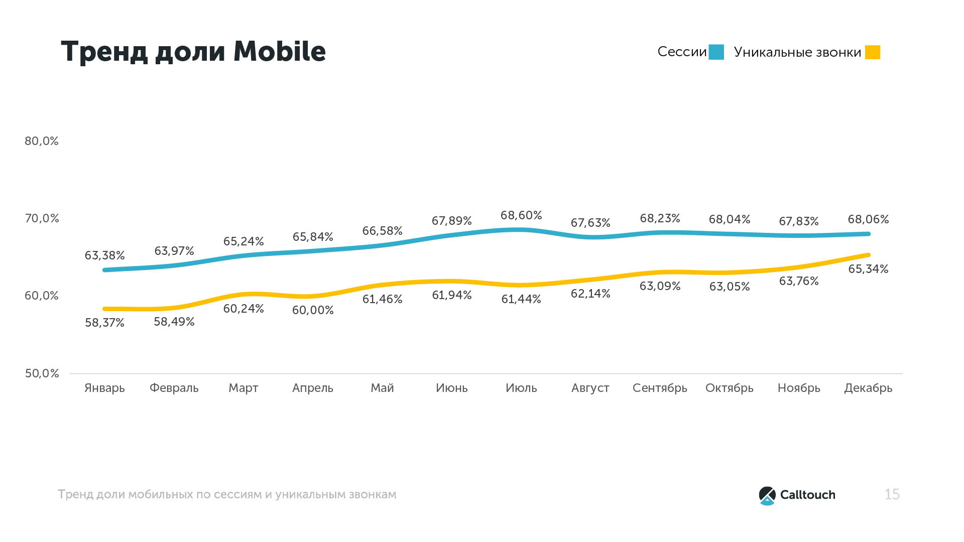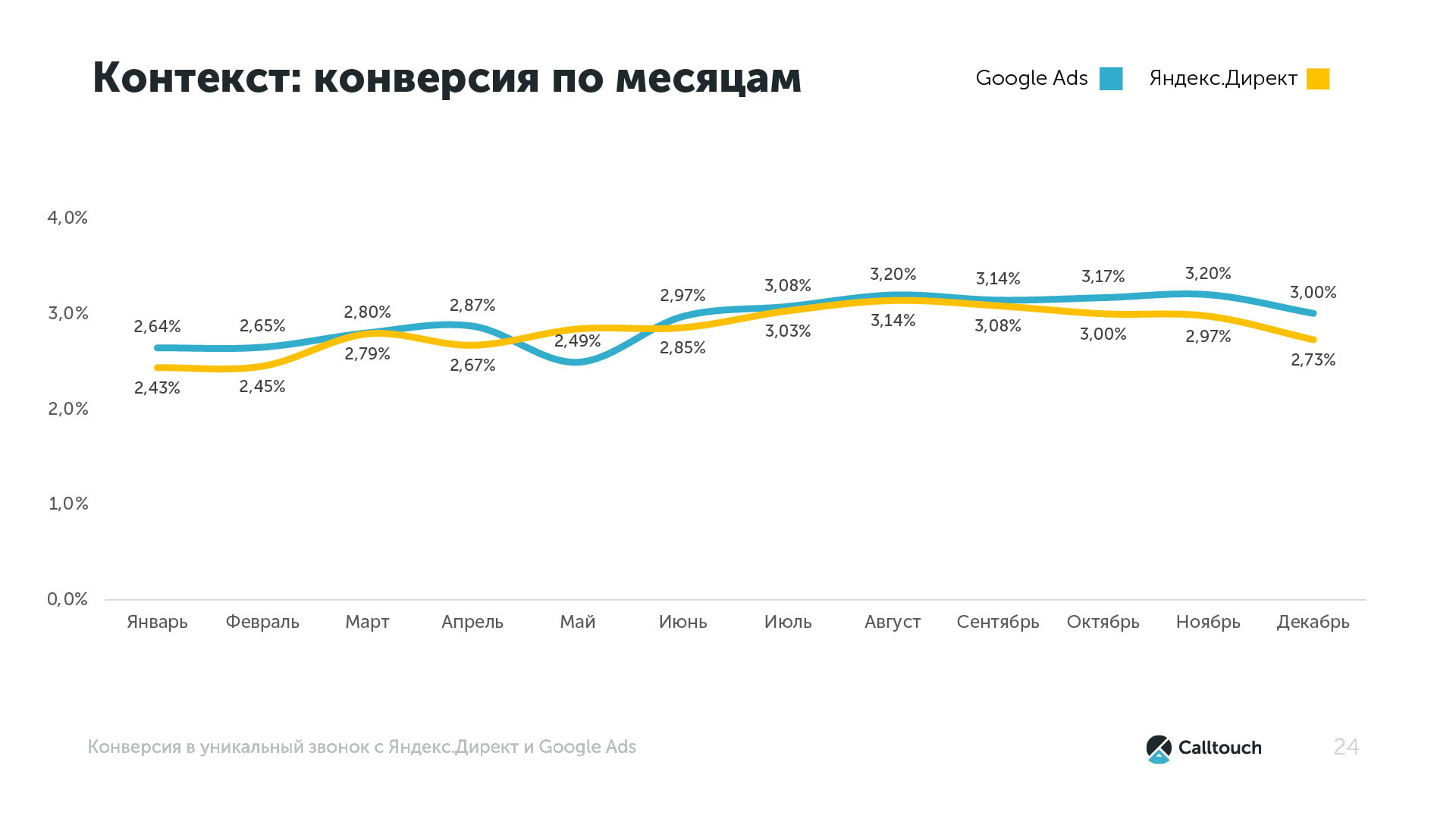 Главная | Блог | Исследования | 2019 | Исследование Calltouch: источники звонков и трафика в медицинской сфереИсследование Calltouch: источники звонков и трафика в медицинской сфере 27 мая 2019 17 мин на чтение 8 517 Callday Callday Алексей АвдеевCEO Calltouch Содержание Нет времени читать? В последние годы медицинские компании стали активнее тратить средства на продвижение своих услуг в digital-сегменте — ведь если тебя нет в сети, то ты выпадаешь из поля зрения клиента. СЕО Calltouch Алексей Авдеев рассказал об исследовании платной рекламы в сегменте медицины.В последние годы медицинские компании стали активнее тратить средства на продвижение своих услуг в digital-сегменте — ведь если тебя нет в сети, то ты выпадаешь из поля зрения клиента. При этом в России 81% пациентов проходит через государственные структуры, а борьба маркетологов разворачивается за узкий сегмент – 19% рынка.Интернет постепенно становится главным каналом продвижения для любой отрасли — по данным ВЦИОМ за 2018 году, 81% россиян пользуется сетью. 65% выходят в интернет ежедневно: совершают покупки, читают новости и, конечно, записываются к врачу.Пациенты просматривают сайты десятка медучреждений, прежде чем сделать выбор. Они читают отзывы, изучают информацию о клиниках и врачах, делая выбор, основанный на фактах.В этих условиях клиники начинают уделять внимание маркетингу, следить за потребительскими трендами и ориентироваться в digital-пространстве. В 2019 году медицинские компании не могут позволить себе игнорировать современные тренды. Отрасль начинает внедрять и использовать современные технологии, адаптировать контент и задействовать искусственный интеллект (ИИ).Мы проанализировали, как медицинские компании задействуют новые каналы продвижения и выяснили, какие особенности в области рекламы прослеживаются на этом рынке.Исходные данные:Период: январь – декабрь 2018 годаГеография: МоскваДанные 350+ медицинских сайтовБолее 3 млн звонковСезонностьВ медицинской отрасли есть слабо выраженная сезонность — весной и осенью. При этом разница в посещаемости сайтов по месяцам — менее 15%. Это совсем незначительные колебания.Из интересного мы обнаружили небольшой, но необычный всплеск посещаемости в июле. Выяснилось, что у 70% сайтов, которые мы исследовали, резко подскочил трафик, преимущественно мобильный. При этом аналогичного всплеска звонков в июле не последовало.Оказалось, что тогда Google выпустил новый алгоритм ранжирования органической выдачи со смартфонов. Мы предположили, что нововведение понижало медленные сайты для «мобильных» пользователей. КоллтрекингОтслеживайте источники звонков с рекламы для ее оценкиВкладывайте в ту рекламу, которая приводит клиентов. Слушайте звонки и улучшайте работу менеджеров. ПерейтиОбычно в топе находятся различные форумы и справочники, в которых пользователи могут изучить статьи про болезни и методы лечения. После релиза Google сайты медицинских компаний отняли довольно большую часть этого низкоконверсионного трафика от тематических форумов и справочников. Но уже к августу ситуация выровнялась.В среднем конверсия звонков составляла 2,5%, и в течение 2018 года мы не заметили сезонных отклонений.Повторные звонкиМы проанализировали звонки со всех уникальных номеров за 4 квартал 2018 года. Оказалось, что один уникальный номер в среднем звонит в одну клинику 1,2 раз