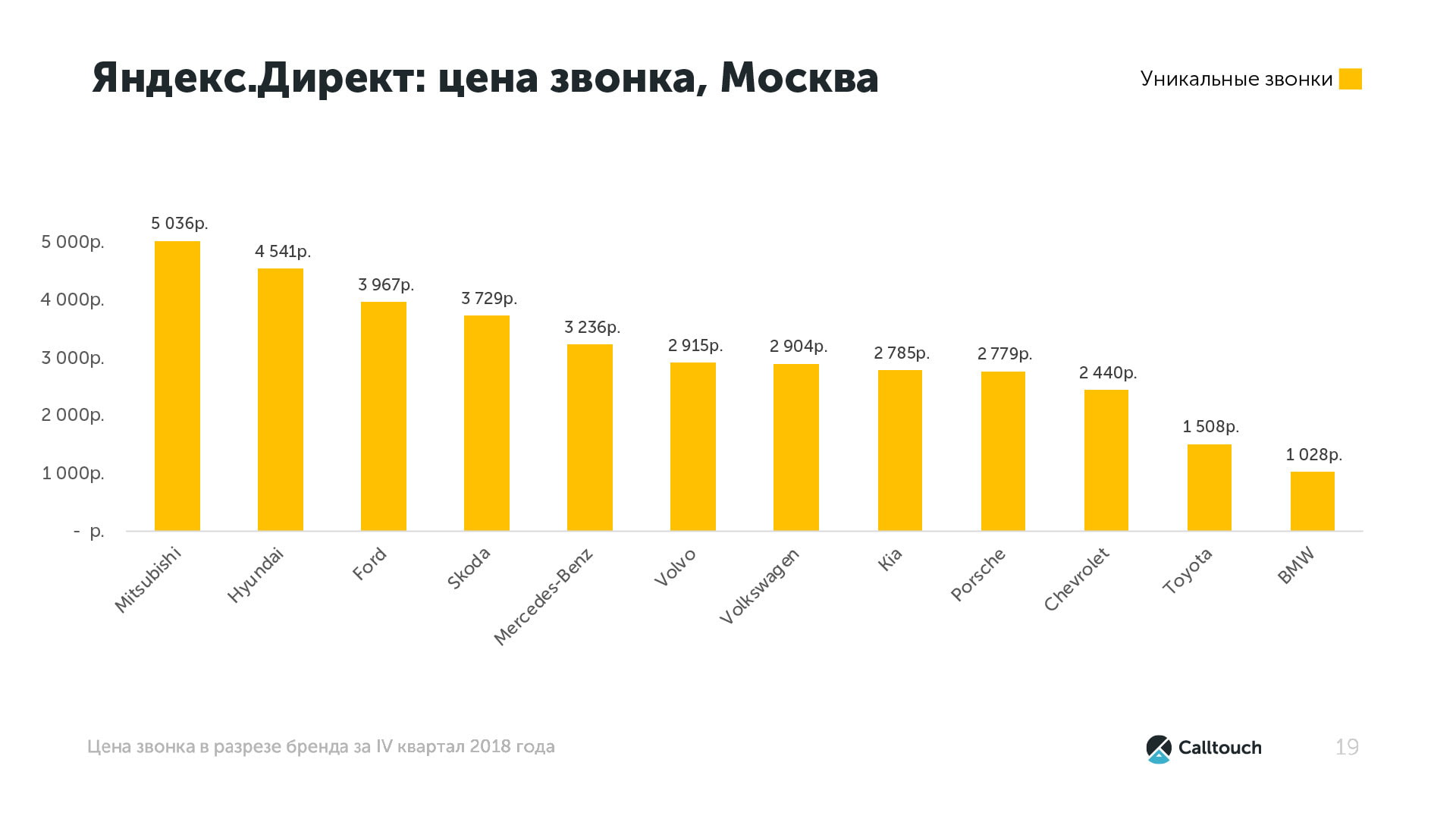 Главная | Блог | Исследования | 2019 | Исследование Calltouch: какие каналы генерируют обращения и трафик в автомобильной сфереИсследование Calltouch: какие каналы генерируют обращения и трафик в автомобильной сфере 25 мая 2019 17 мин на чтение 8 876 Callday Callday Алексей АвдеевCEO Calltouch Содержание Нет времени читать? Продажа автомобилей считается довольно консервативной отраслью. Однако высокая конкуренция заставляет автодилеров идти в ногу со временем и использовать самые современные маркетинговые технологии. Эффективность рекламы зависит от многих факторов. От каких именно, разбирается CEO Calltouch Алексей Авдеев.Автомобильный рынок всегда был и остаётся высококонкурентным, борьба за клиентов ведётся на разных полях, в том числе дилерские центры активно используют дорогостоящие и самые новые рекламные и digital-инструменты, закладывая весомые бюджеты на продвижение. Чтобы достичь высоких показателей ROI, важно понимать, какой канал наиболее эффективен и как клиент движется по всей воронке продаж. И здесь на помощь маркетологам приходит сквозная аналитика, она позволяет следить за процессом коммуникации с клиентом на всех этапах взаимодействия, а интеграция с CRM-системой компании позволяет выстроить всю воронку от показа рекламы до денег в кассе.Calltouch зарекомендовал себя как удобный и функциональный сервис для выстраивания сквозной аналитики и управления рекламой. Все продукты адаптированы под запросы отрасли. Основываясь на открытых данных, мы провели исследование автомобильного сегмента и выяснили, какие каналы продвижения сегодня генерируют больше всего лидов.Исходные данныеПериод: 1 января–31 декабря 2018 годаДанные более 500 сайтов официальных автодилеровБолее 2 млн звонковВыборка по Москве и Московской областиСезонностьНа начальном этапе мы решили выявить сезонность интереса пользователей. Оказалось, что в течение года на графике посещаемости сайтов автодилеров заметных колебаний нет. Наблюдаются небольшие скачки весной и осенью, но они весьма незначительны. Самый большой спад приходится на декабрь, но и он не сильно пугающий.График звонков ещё более ровный. Даже в конце года сколько-нибудь заметного уменьшения количества обращений не наблюдается.Соответственно, вероятность того, что посетитель сайта совершит звонок в течение года практически одинакова: 0,9–1,2%. При этом увеличение на 0,3 процентного пункта к декабрю свидетельствует о том, что ситуация на рынке улучшается – люди не просто посещают сайты автодилеров и представляют себя за рулём нового автомобиля, а именно нацелены на покупку.Повторные звонкиМы проанализировали звонки за четвёртый квартал и выяснили, что с одного номера в один дилерский центр в среднем поступает 1,4 обращения (за три месяца), а также что с одного номера обращения поступают в среднем два разных дилерских центра.Этот факт – ещё одно доказательство жёсткой конкуренции на рынке. Представители компаний должны понимать, что с большой долей вероятности потенциальный покупатель обратится не только к ним, а ещё и к конкурентам, чтобы сравнить условия и выбрать для себя лучшие. Поэтому дилерам очень важно качественно обработать первичные обращения. КоллтрекингОтслеживайте источники звонков с рекламы для ее оценкиВкладывайте в ту рекламу, которая приводит клиентов. Слушайте звонки и улучшайте работу менед