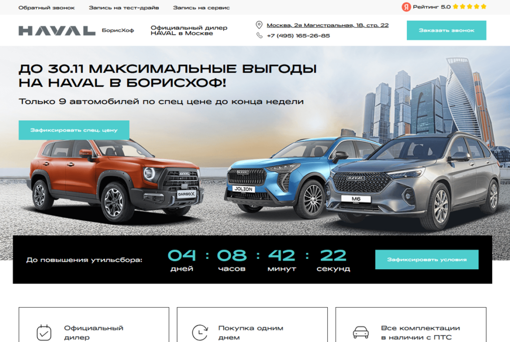 Главная | Блог | Кейсы | Кейс «БорисХоф» х «Адекво»: как получить 233 звонка в месяц по HavalКейс «БорисХоф» х «Адекво»: как получить 233 звонка в месяц по Haval 12 января 2026 15 мин на чтение 1 151 коллтрекинг сквозная аналитика Обратный звонок коллтрекинг сквозная аналитика Обратный звонок Нина ОпалькоСтарший редактор Calltouch Содержание Нет времени читать? Запустить мощное продвижение автосалона на гиперконкурентном рынке — задача сама по себе непростая. А если на выполнение есть всего пара месяцев, ключевой KPI — 200 звонков от заинтересованных покупателей, а цена ошибки измеряется сотнями тысяч рублей? Именно с таким вызовом столкнулось агентство «Адекво», работая с ГК «БорисХоф».Нужно было не просто запустить рекламу, а создать отлаженную систему, где каждый клик мог быть просчитан и оценен. В этом кейсе мы детально разберем, как был реализован этот проект: от анализа конкурентов и создания лендинга до тончайшей настройки аналитики.О компанииГруппа компаний «БорисХоф» — один из лидеров российского автомобильного рынка с историей, начавшейся в 1992 году. За три десятилетия компания выросла в крупный холдинг с дилерскими центрами в Москве, Московской области и Санкт-Петербурге. Сегодня компания является официальным дилером более 20 престижных автомобильных марок, включая BMW, MINI, Jaguar, Land Rover, Volvo, Rolls-Royce, а также популярные корейские и китайские бренды, такие как Hyundai, Genesis, Geely, EXEED и TANK. Ключевые фокусы «БорисХоф» сегодня — гибкая адаптация к рынку, глубокая цифровая трансформация и развитие своей большой команды сотрудников.Digital-агентство «Адекво» предоставляет полный комплекс услуг интернет-маркетинга. Основанное в 2018 году, агентство специализируется на стратегическом продвижении, которое включает в себя контекстную и таргетированную рекламу, SEO, разработку сайтов, а также управление репутацией в интернете.Исходные данные: гонка на время с амбициозной цельюВ феврале 2024 года в агентство обратился клиент с задачей, которую можно было бы в двух словах описать как «срочно и масштабно». Нужно было в кратчайшие сроки с нуля разработать лендинг, посвященный новой для дилера марки авто (Haval) и сразу же запустить на него поток клиентов через контекстную рекламу.Но самой интересной частью был не срок, а конкретная и очень амбициозная цель, поставленная импортером. Уже ко второму месяцу работы было необходимо обеспечить не менее 200 уникальных и целевых звонков в отдел продаж новых автомобилей, а стоимость каждого такого звонка должна была быть не выше 10 000 рублей.Агентство не просто запускало рекламу в надежде на звонки. Оно с самого старта взяло на себя обязательство по конкретному объему качественных лидов (потенциальных клиентов) с четкой ценой. Вызов был принят!Двойная задача: цифровой шоурум и поток гостейЗадача состояла из двух важных частей, которые нужно было выполнить практически одновременно.Создать лендинг — цифровой шоурум для авто. В первую очередь требовалось разработать специальную посадочную страницу, которая должна была стать полноценным онлайн-представителем бренда. Она должна была не только красиво показывать автомобили, но и строго соответствовать всем фирменным стандартам марки, чтобы у посетителя с первых секунд сложилось правильное впечатление.Обеспечить качественный трафик. Параллельно нужно было настраивать рекл