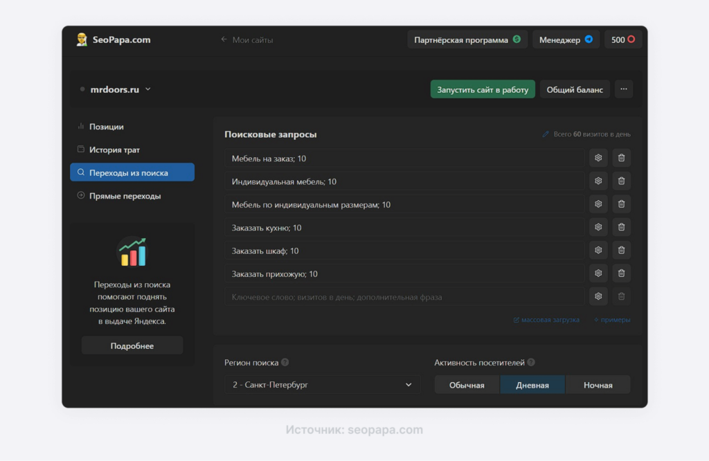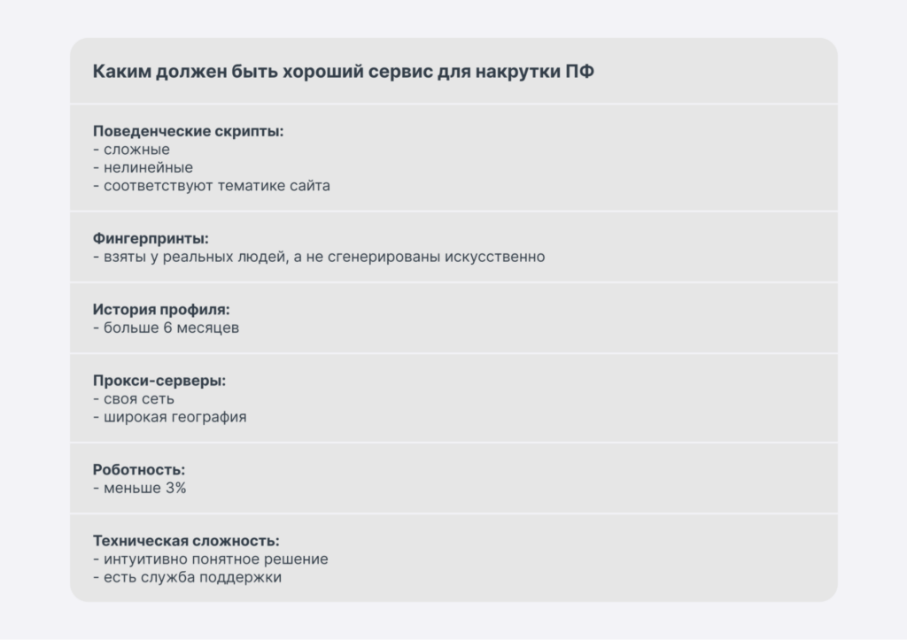 Главная | Блог | Полезные статьи | Привлечение | Накрутка поведенческих факторов: топ-10 лучших решений в 2025 годуНакрутка поведенческих факторов: топ-10 лучших решений в 2025 году 22 сентября 2025 45 мин на чтение 1 111 SEO SEO Нина ОпалькоСтарший редактор Calltouch Содержание Нет времени читать? Успех сайта напрямую зависит от его позиции в выдаче поисковых систем. Но попасть в топ-10 становится все сложнее. Компании тратят огромные бюджеты на то, чтобы улучшить свой рейтинг, и зачастую это не приводит к нужному результату.Разбираемся, как гарантированно повысить рейтинг сайта в выдаче Яндекса с помощью накрутки поведенческих факторов. И рассказываем про 10 лучших сервисов в этой сфере.Что такое ПФПараметры, которые характеризуют действия человека на сайте и в поисковике называют поведенческими факторами, сокращенно – ПФ. Это, например, количество просмотренных страниц или время, проведенное на ресурсе.Поисковые системы – Яндекс и Google – анализируют поведенческие факторы, чтобы оценить, насколько хорошо сайт решает задачу из запроса. В Яндексе ПФ имеют очень большой вес – ресурсы с позитивными поведенческими факторами быстро попадают в топ выдачи. В Google значимость таких факторов ниже, но они тоже важны для рейтинга сайта.Какие бывают ПФПоведенческие факторы могут быть внешними и внутренними.Внешние ПФ сайта – это поведение пользователей вне ресурса. В том числе:частота клика по сниппету сайта в выдаче Яндекс или Google – его CTR;скорость возврата к поиску после посещения ресурса;наличие прямых переходов по сохраненной ссылке;переходы из большого числа источников – рассылок, соцсетей и т. д.Внутренние ПФ сайта – это активность на самом ресурсе. К ним относится:количество минут, которое пользователь провел на сайте;глубина просмотра – количество открытых страниц;быстро ли ушел с сайта, процент отказов;количество целевых действий – кликов по кнопкам, просмотров видео и т. д. Для улучшения рейтинга сайта надо работать и с внешними, и с внутренними поведенческими факторами.Как работает накруткаПоведенческие факторы можно улучшить с помощью имитации активных действий посетителя сайта и поисковика. Искусственное повышение ПФ называется накруткой.К примеру, программа или реальный человек заходит на сайт. Там он водит «мышкой», нажимает на кнопки и совершает другие действия. Поисковая система замечает эту активность и решает, что поведенческие факторы ресурса повысились. Благодаря этому улучшает его рейтинг в выдаче. Если таких переходов было много, то сайт может попасть в топ.Чем отличаются разные решенияТехническая сложность. Все сервисы и программы по накрутке ПФ отличаются уровнем сложности. Некоторые решения ориентированы только на очень опытных SEO-специалистов, и перед запуском продвижения надо выполнить 50+ настроек. Другие сервисы – интуитивно понятны, и начать работу в них можно быстро и без дополнительного обучения.Тип накрутки. Действия может выполнять программа или специально нанятый для этого человек. У каждого подхода есть свои плюсы и минусы. Например, программа не совершает ошибки и действует по заданному алгоритму, а человека надо контролировать – чаще всего вручную.Поведенческие скрипты. Чем сложнее сценарий поведения на сайте и в поиске, тем эффективнее продвижение. В однотипных и линейных действиях система скорее все
