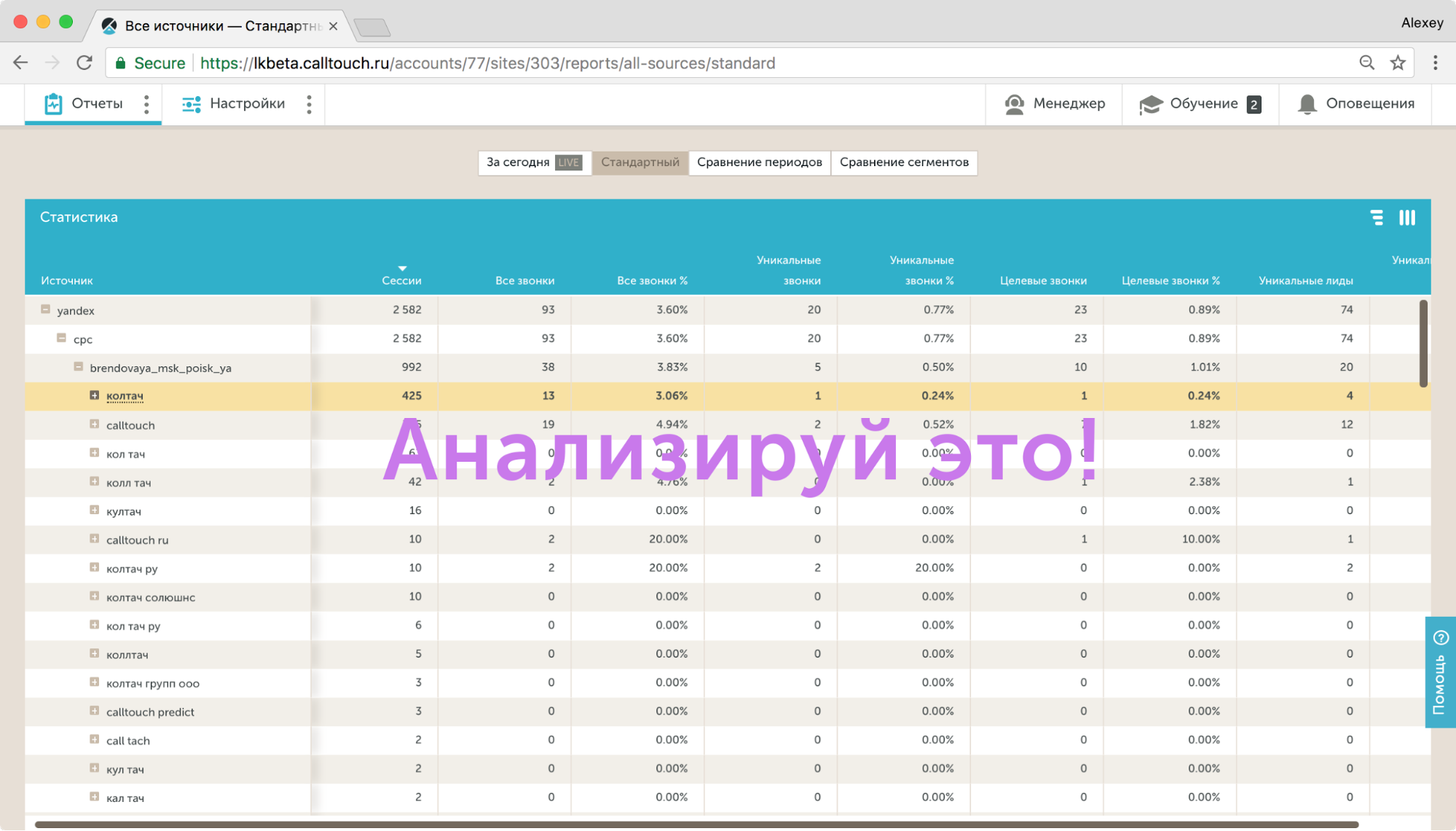 Главная | Блог | Продукты Calltouch | Добро пожаловать в новый личный кабинет Calltouch!Добро пожаловать в новый личный кабинет Calltouch! 28 декабря 2017 13 мин на чтение 5 262 Алексей ФилимоновРуководитель отдела сквозной аналитики Calltouch Содержание Нет времени читать? Calltouch не перестает радовать своих клиентов обновлениями! С радостью представляем вам новый личный кабинет – еще быстрее, еще дружелюбнее, еще круче. Основные фичи:Обучающий вебинар для тех, кто не любит читать Гуру нового личного кабинета Calltouch рассказывает пользовательские лайфхаки и секреты, которые сделают работу с кабинетом еще удобнее!Посмотрели? А теперь по пунктам – самое вкусное из нового личного кабинета и маленький сюрприз в конце!Единая навигацияCalltouch сделал единую логику работы со всеми отчетами. Это поможет вам экономить время – достаточно на одном отчете понять, как все устроено, и с другими отчетами работайте по уже знакомой вам логике:Кстати, об экономии времени – Calltouch буквально за пару секунд подгрузит в отчет данные за любой период: день, месяц или даже год. На скорость загрузки количество данных никак не повлияет. В левой части «шапки» вы можете выбрать любой отчет:А в правой можно увидеть баланс, логин, а также «менеджер», «обучение» и «оповещения»:Все в одном окне.Уровни вложенностиОтчеты Calltouch теперь максимально удобны и понятны. Они устроены по принципу всем знакомых папок на компьютере: перемещайте отчеты, вкладывайте один в другой и размещайте их так, как вам удобно. Перетаскивайте их, вкладывайте одну метрику в другую, создавайте свой собственный интерфейс, как с папками и файлами на ПК.Тепловая картаВ новом личном кабинете вас встретит понятная визуализация данных – тепловая карта, которая позволит произвести детальный анализ количества лидов. В тот или иной час по каждому дню недели, тепловая карта наглядно демонстрирует информацию по лидам с помощью разной глубины цвета в ячейках, в зависимости от величины значения. Чем глубже цвет, тем больше значение. Статистика тепловой карты отображается в четырех режимах:Вкладка «Абсолютное» отображает сумму всех звонков за выбранный период;Вкладка «Среднее» отображает сумму всех звонков, деленных на количество дней в периоде;Вкладка «Конверсия» отображает отношение количества звонков к количеству сессий за период;Вкладка «Отклонение» отображает самую полезную информацию для настройки ставок контекстной рекламы в зависимости от времени.Сравнение периодовДва… Всегда лучше, чем один! Теперь в личном кабинете Calltouch вы можете не только просматривать отчеты по периодам, но и моментально сравнивать показатели разных временных отрезков. За пару минут узнайте, как отрабатываются вложенные в рекламу деньги, когда и сколько лидов пришло с того или иного источника. А детальный анализ данных проводится с помощью таблиц в каждом отчете.Отчеты коллегамЛучше один раз показать, чем семь раз рассказать. Теперь вы можете отправлять коллегам отчеты в несколько кликов. Кликните кнопку «Скачать», и вы получите отчет в формате CSV. В выгрузку попадут отображаемые в данный момент столбцы и таблицы с условиями фильтра.Через несколько минут (в зависимости от количества выгружаемых данных время варьируется) вы получите оповещение, что ваш отчет готов. Все заказанные отчеты находятся в личном кабинете, перейдя в раздел «З