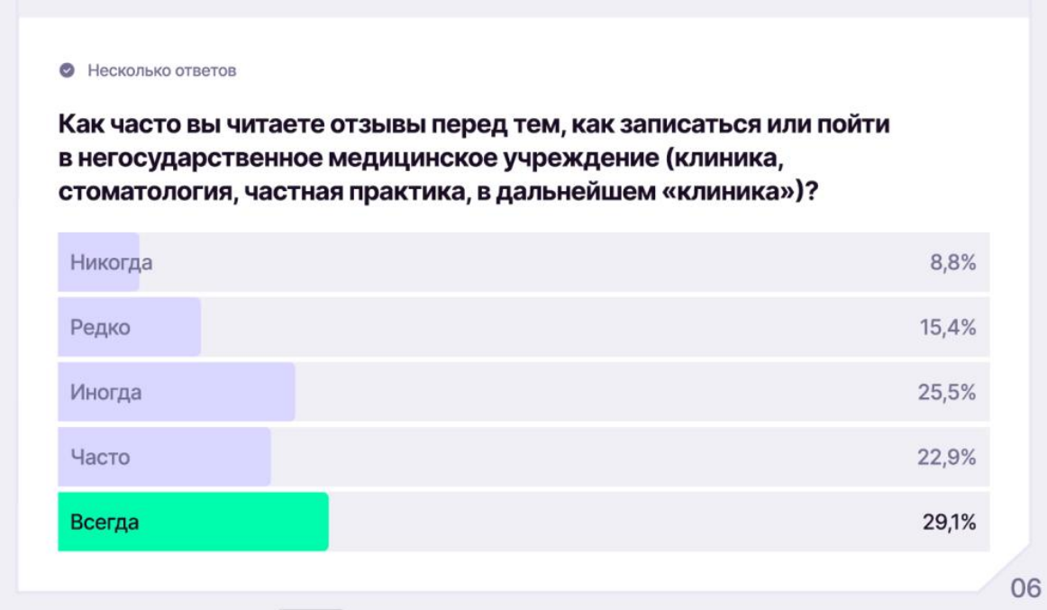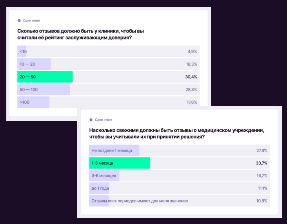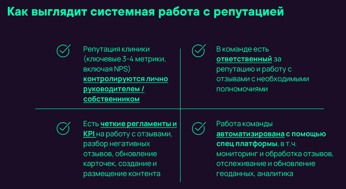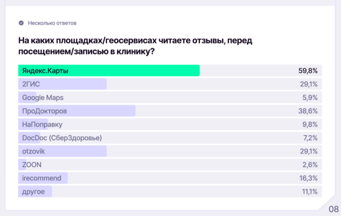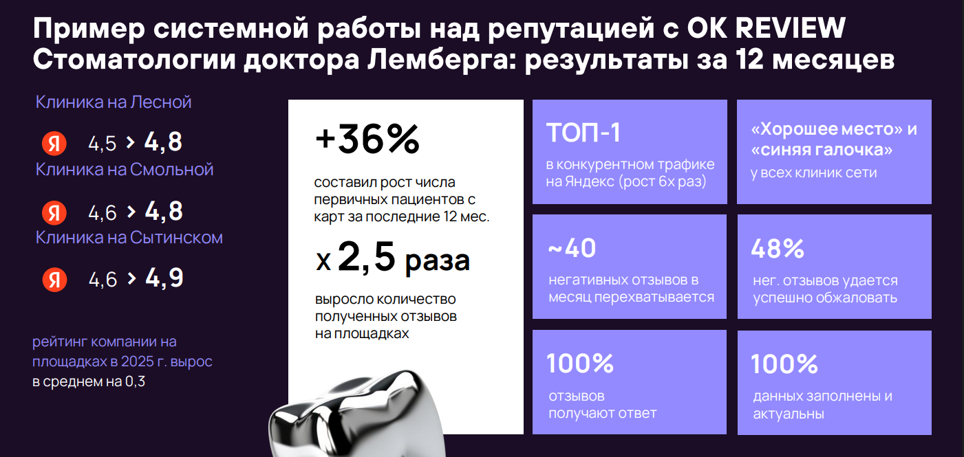 Главная | Блог | Кейсы | Е-коммерс | От поиска до лояльности: как репутация работает на каждом этапе пути пациента. Данные OK REVIEWОт поиска до лояльности: как репутация работает на каждом этапе пути пациента. Данные OK REVIEW 15 апреля 2026 23 мин на чтение 40 геосервисы геосервисы Нина ОпалькоСтарший редактор Calltouch Содержание Нет времени читать? Многие клиники сегодня живут с ощущением, что если они есть на карте и у них неплохой рейтинг, то с репутацией все в порядке. Но пациенты мыслят иначе. Они читают отзывы на 2-3 площадках, обращают внимание на их свежесть, оценивают, как клиника отвечает на негатив, сравнивают карточки с конкурентами.Сергей Литвиненко, основатель сервиса OK REVIEW, на конференции «Колдэй.Медицина 2026» разобрал, как клинике выстроить системную работу с репутацией. Мы собрали ключевые тезисы из его выступления, подкрепленные данными исследования OK REVIEW.О сервисеOK REVIEW — это сервис по управлению онлайн-репутацией. Компания помогает бизнесу собирать реальные отзывы клиентов, мониторить упоминания на крупных интернет-площадках и работать с ними в едином интерфейсе. Платформа сочетает IT-разработку и сервис, предоставляя инструменты для аналитики, сбора обратной связи и реагирования на негатив. Работа сервиса направлена на решение следующих задач:привлечь больше отзывов, улучшить рейтинг на геосервисах и отзовиках;автоматизировать работу с отзывами на всех крупнейших онлайн-площадках;поддерживать актуальность данных о бизнесе в геосервисах и поисковиках;помогать принимать решения на основе данных — предоставлять аналитику обратной связи клиентов по всем отзывам.С компанией работают как крупные сети, так и клиники с единственным филиалом. Максимальное количество локаций, управляемых через OK REVIEW для одного клиента, — более 1 300.Ключевой фактор конверсии: как репутация работает на каждом этапеРепутация клиники проходит через весь путь пациента от первого поиска до возвращения. Вот как это работает.Этап 1. ПоискПациент только начинает искать клинику и врачей. Здесь ключевую роль играют не люди, а алгоритмы поисковых систем и агрегаторов. Для них значимы высокий рейтинг, большое количество свежих отзывов, системная работа с ответами, карточки, адаптированные под поисковую выдачу, присутствие врача-эксперта в медиаполе. Задача клиники — сделать так, чтобы машины посчитали клинику наиболее релевантной для конкретного пациента.Этап 2. ВыборНа этом этапе включается сам человек. Пациент изучает рейтинги, вчитывается в отзывы, анализирует ответы на негатив и позитив, знакомится с контентом в карточках и социальных сетях. Решение принимает человек, и репутация здесь важна с точки зрения качества информации. Работают описание услуг, опыт врачей, технологии, оборудование, награды, прозрачные цены, сценарии лечения, ответы на часто задаваемые вопросы и полезные информационные материалы.Этап 3. ЗаписьНа этапе записи пациенту нужен удобный опыт: запись в два клика, через мессенджеры, свободные слоты, выбор врача, предоплата или бронь, напоминания. Минимум ожидания и действий. Репутация здесь проявляется через бейджи рейтинга, квалификацию врачей, лицензии и сертификаты, которые подтверждают правильность выбора.Этап 4. Визит в клиникуЭто зона профессиональной операционной деятельности: подтверждение визита, навигация, время ожи