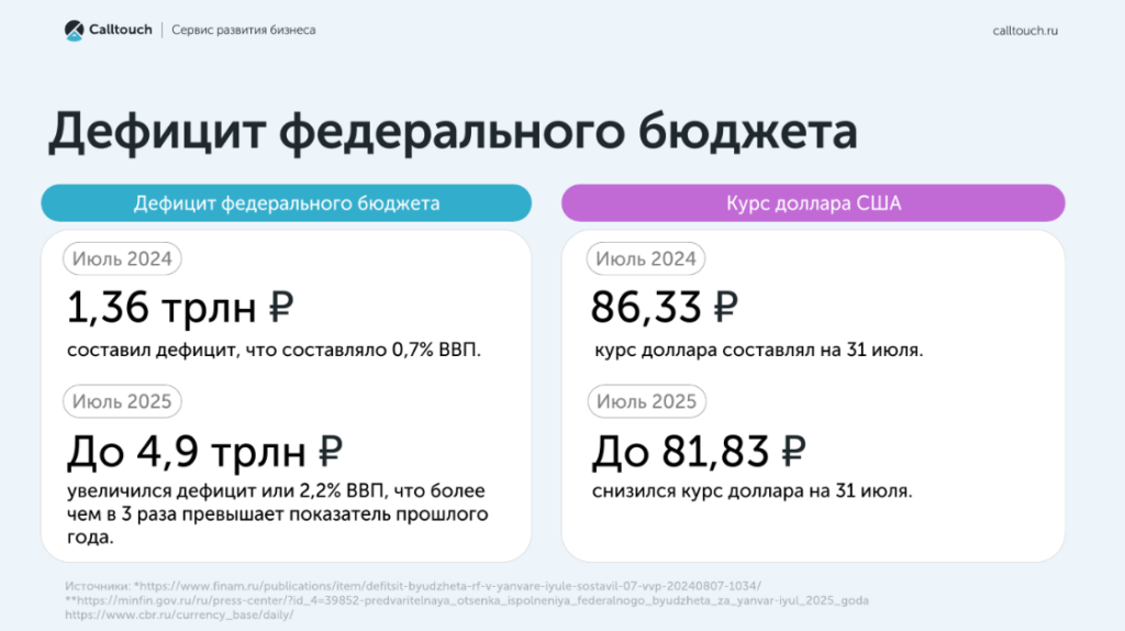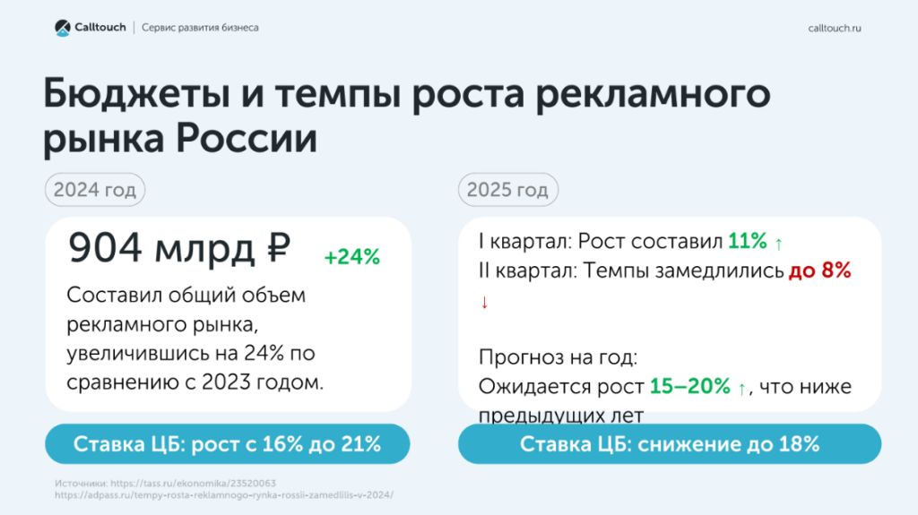 Главная | Блог | Мероприятия | Callday | Спрос и маркетинг в агентском бизнесе: исследование Calltouch 2025Спрос и маркетинг в агентском бизнесе: исследование Calltouch 2025 17 октября 2025 15 мин на чтение 45 Callday Callday Нина ОпалькоСтарший редактор Calltouch Содержание Нет времени читать? В 2025 году маркетинговые агентства переживают не самые благоприятные времена. Приходится биться за каждого привлеченного лида и доказывать его уникальность. Подготовили статистику и подборку инструментов, которые помогут агентствам обеспечить трафик и конверсии для своих клиентов, а себе — хорошие комиссионные.Современный рынок агентских услуг стремительно меняется, всем приходится адаптироваться к новым реалиям экономической обстановки в стране. Повышение конкуренции и изменение потребительских предпочтений заставляют маркетологов искать новые подходы и эффективные инструменты для достижения целей бизнеса. Генеральный директор Calltouch Артур Саркисян выступил с обзором основных направлений развития агентского маркетинга в 2025 году. О том, как агентствам зарабатывать на улучшении показателей своих клиентов и какие передовые инструменты в этом помогут, он рассказал на ежегодной конференции для профи агентского бизнеса Callday.Agency 2025. Но для начала немного статистики. Бюджеты и темпы роста рекламного рынка РоссииОбщий объем рекламного рынка в 2024 году составил 904 млрд рублей, что на 24% больше показателя 2023. Ставка ЦБ в 2024 году подскочила с 16 до 21%. В таких условиях кредиты стали очень дорогими и для бизнеса стало гораздо сложнее закупать продукцию с целью дальнейшей дистрибьюции. Ведь обычно закупки проводят не на накопленные бюджеты, а за счет кредитных средств.В первом квартале 2025 года объем рекламного рынка повысился на 11%, но уже во втором квартале упал на 8% — темпы замедлились. По прогнозам Calltouch к концу года должно произойти улучшение ситуации: снижение ставки ЦБ до 18% и рост объема рынка на 15-20%. Но появляется еще одна сложность — дефицит федерального бюджета. В июле 2024 дефицит бюджета составлял 0,7% от ВВП, а в 2025 показатель увеличился до 2,2% ВВП. Такая неустойчивость экономики приводит к дилемме потребителя: нужно ли покупать что-то сейчас или отложить деньги до лучших времен. Тем не менее, на волне прогнозов о снижении ставки ЦБ многие принимают решение инвестировать. Поэтому один из ключевых трендов развития бизнеса — выход на маркетплейсы. Порог для входа небольшой, что и привлекает компании развиваться в этом направлении. Для старта достаточно открыть юрлицо, наладить логистику и договориться с Ozon или Wildberries. Тем не менее это не самый стандартный бизнес, в котором все привыкли работать. Поэтому сейчас задача агентского бизнеса — адаптироваться к новым реалиям, чтобы помогать селлерам продавать на маркетплейсах и зарабатывать на этом деньги. Здоровье бизнесаЗа первое полугодие 2025 года по России было зарегистрировано 95 тысяч компаний. Но при этом прекратила свое существование 141 тысяча компаний. Количество обращений в агентства снижается. Поэтому бизнесу каждый раз приходится голосовать рублем, чтобы участвовать в аукционе, перебивать аудиторию и заманивать к себе пользователей.Чтобы остаться на плаву в эпоху не самой благоприятной экономической обстановки, стоит оптимизировать издержки. Тренд в развитии агентского бизнеса в 2025 годуВ рамках российског