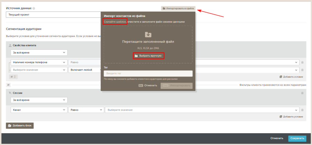 В аудиторию проекта импортируется Xls файл, через который клиентский база импортируется в Личный кабинет. При импорте нужно указать тег, по которому в дальнейшем можно опознать импортированных клиентов и настроить по ним триггерный сценарий.