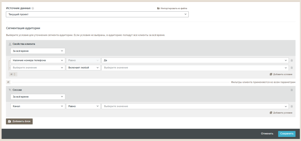 Для сегментирования клиентов вам доступны определенные фильтры, позволяющие собрать максимально подходящий портрет целевой аудитории под ваши задачи.