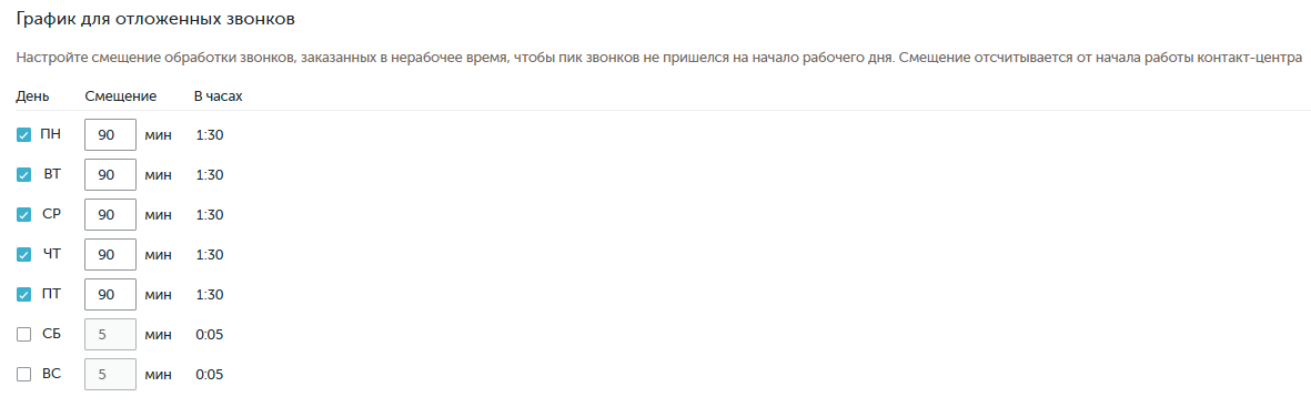 Вы можете настроить смещение времени обработки звонков, оставленных в нерабочее время контакт-центра. Смещение отсчитывается от времени начала работы контакт-центра. Например, контакт-центр работает с 9-00, смещение настроено на 45 минут, обработка заявок, оставленных в нерабочее время, начнется в 09-45. Если день является нерабочим, выбранное по нему смещение будет игнорироваться.