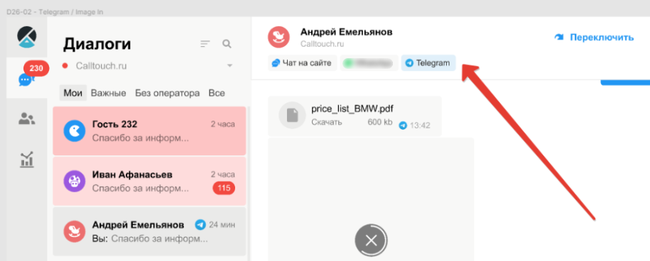 Чаты Calltouch позволяют обмениваться файлами не только между оператором и посетителем, но и с пользователями, которые пишут во ВКонтакте или Telegram.