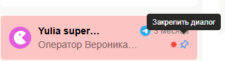 Оператор может закрепить до 5 диалогов. Диалог закрепляется при наведении и нажатии на иконку pin около диалога. Иконка появляется в самой правой части диалога, сдвигая точку состояния диалога. После нажатия на иконку выбранный диалог перемещается вверх, сдвигая все диалоги вниз под себя.