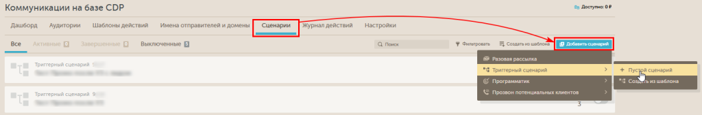 Переходим в "Разовые сценарии/Триггерные рассылки" / нажимаем "Создать рассылку"/"Создать сценарий" / В действии сценария выбираем "СМС клиенту".