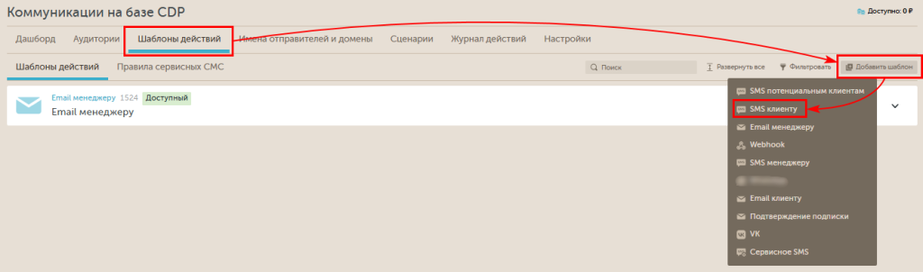 Переходим в "Шаблоны действий" / нажимаем "Добавить шаблон" / выбираем "SMS клиенту".