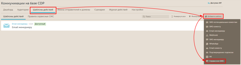 Переходим в "Шаблоны действий" / нажимаем "Добавить шаблон" / выбираем "Сервисное SMS".