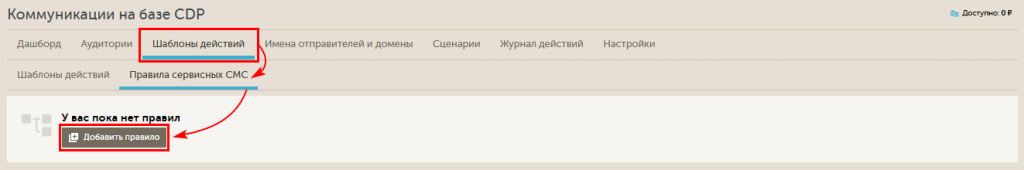 Далее выбираем вкладку "Шаблоны действий" / переходим во вкладку "Правила сервисных СМС" / нажимаем "Добавить правило".