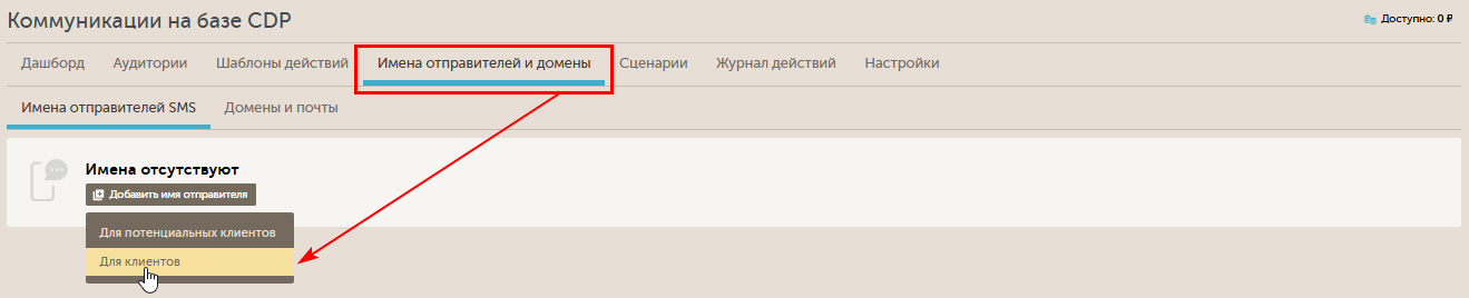 Далее выбираем вкладку "Имена отправителей и домены" / нажимаем "Добавить имя отправителя" / выбираем из выпадающего списка "Для клиентов" / создаем имя.