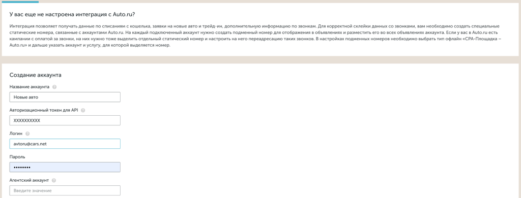 Если вы используете для интеграции агентский доступ (имеет доступ к нескольким аккаунтам Авто.ру), укажите ID клиента в поле «Агентский доступ» (этот ID можно получить у вашего менеджера Авто.ру). Тогда мы сможем подтягивать статистику только для указанного аккаунта. Если вы не заполните это поле, подключаясь через агентский доступ, попытка интеграции упадет с ошибкой.