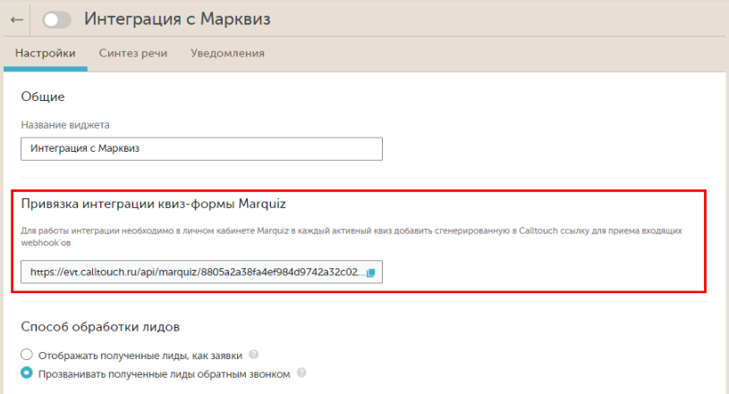Данную ссылку нужно будет прописать в личном кабинете Марквиз для отправки данных в Calltouch.
