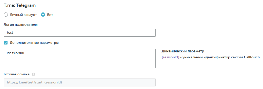 При активации чекбокса “Передавать id сессии при переходе в мессенджер” к ссылке добавляется параметр start с уникальным значением сессии из Calltouch.