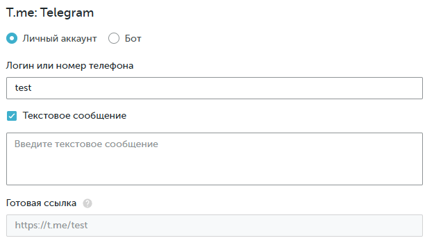 Введите логин пользователя Telegram (username) в соответствующее поле для формирования ссылки, при переходе по которой произойдет переадресация в чат.