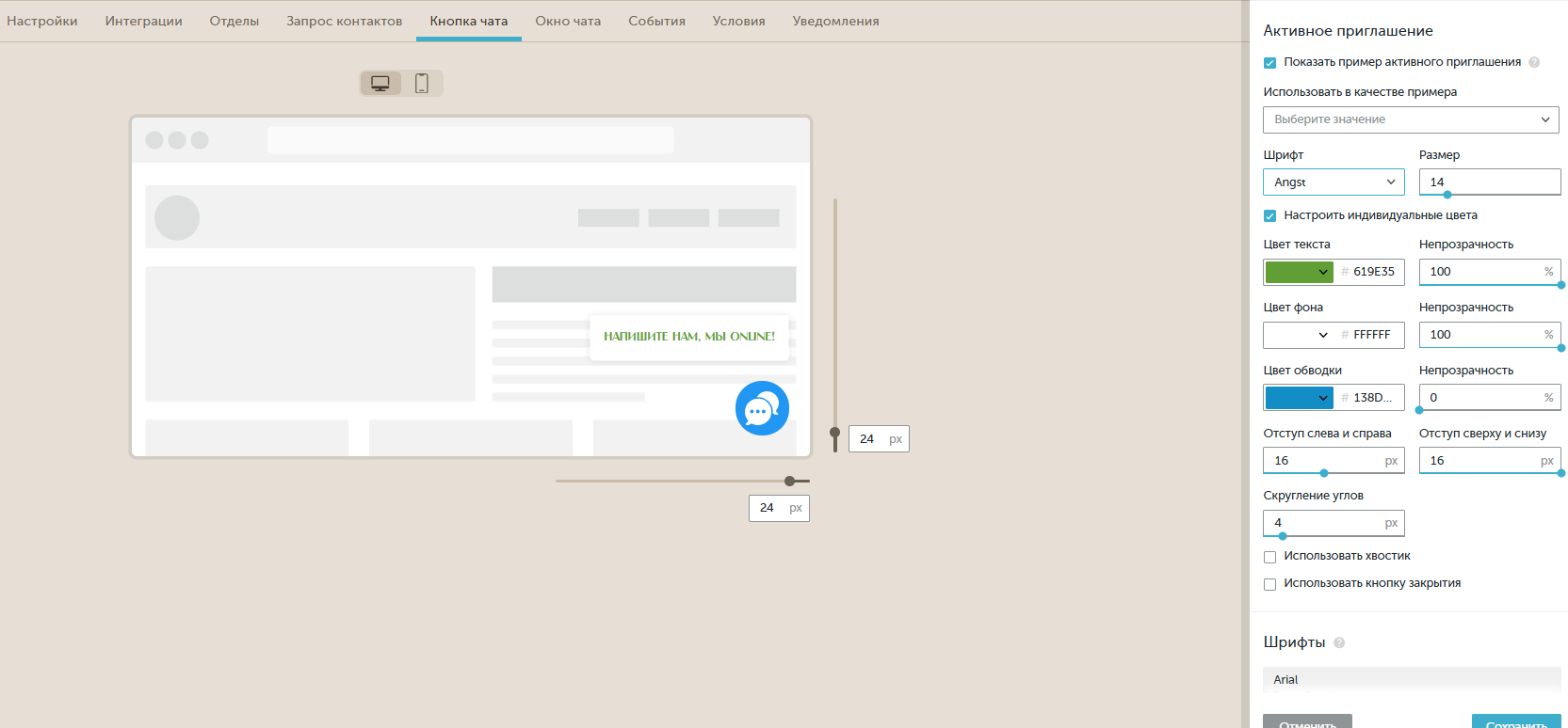 Позволяет настраивать цвет, форму, расположение, размер шрифта активных приглашений (всплывающие окна, приглашающие к началу диалога), загрузить свой индивидуальный шрифт. Настройка доступна и для десктопа, и для мобайла.