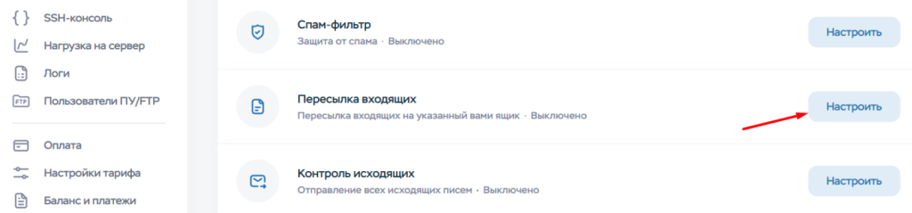Кликните «Настроить» в блоке «Пересылка входящих»: