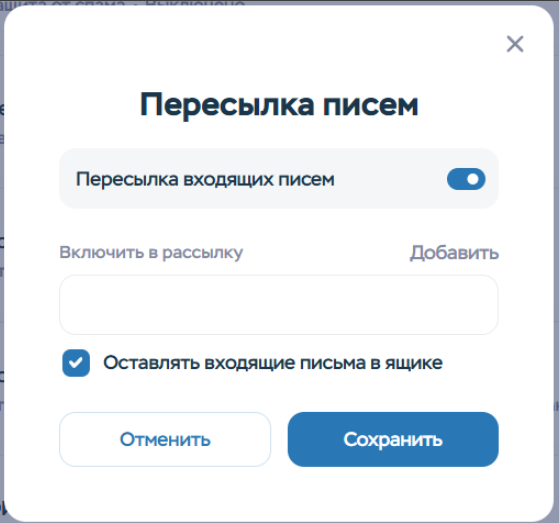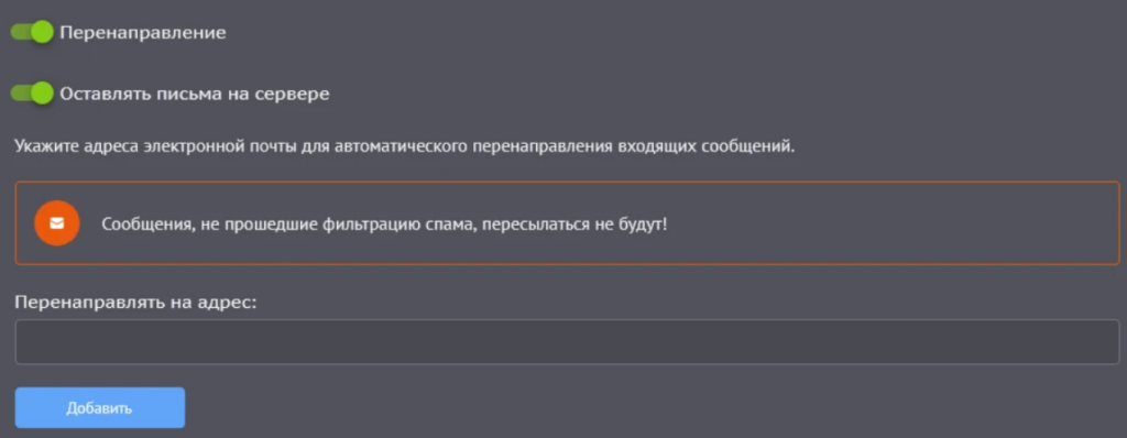 В открывшемся окне активируйте настройки: «Пересылка входящих писем» и «Оставлять входящие письма», укажите технический email Calltouch, на который должны пересылаться письма и нажмите «Добавить»: