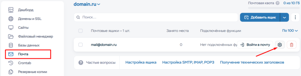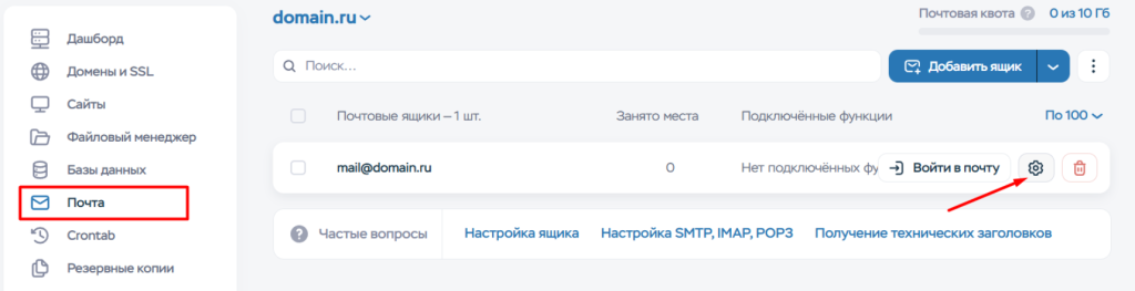 Кликните на значок шестеренки у ящика который принимает письма с подменных email-адресов, чтобы перейти к настройкам: