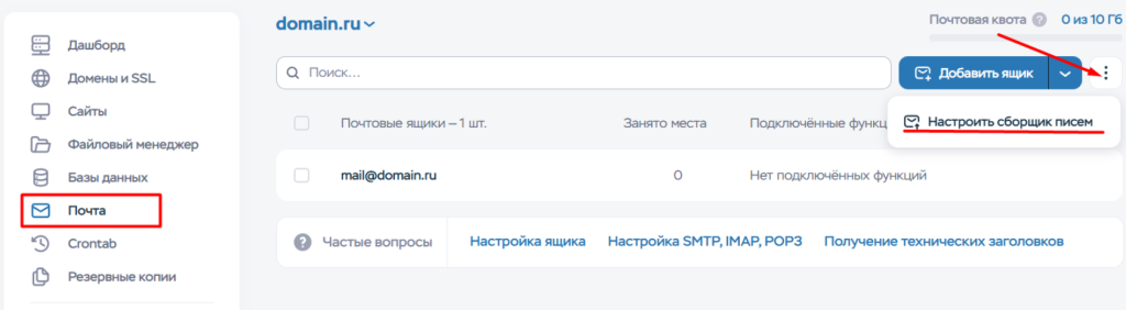 Кликните на три точки над списком ящиков и выберите «Настроить сборщик писем»: