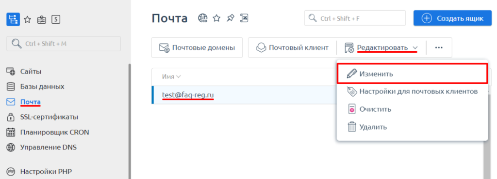 Перейдите в раздел Почта и выберите почтовый ящик, который принимает письма с подменных email-адресов и нажмите «Изменить»: