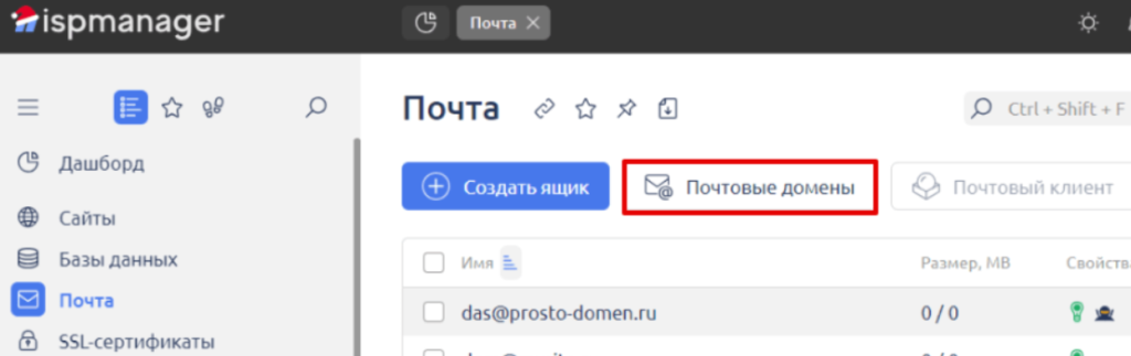 Перейдите в раздел Почта и кликните на кнопку «Почтовые домены»: