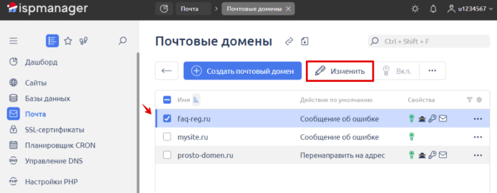 Выберите нужный домен и кликните на кнопку «Изменить»: