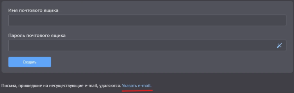 Под блоком создания нового ящика в тексте "Письма, пришедшие на несуществующие e-mail, удаляются. Указать e-mail." нажмите на "Указать e-mail":