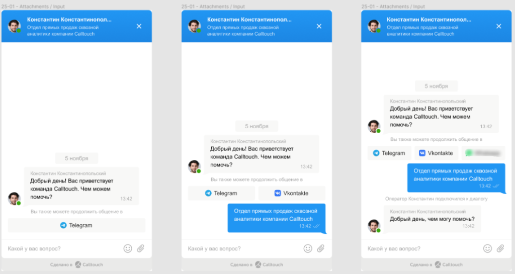 - Если диалог новый, вместо имени оператора и должности — две надписи, заданные в настройках, События (Автоприветствие). Логотип задан там же.
