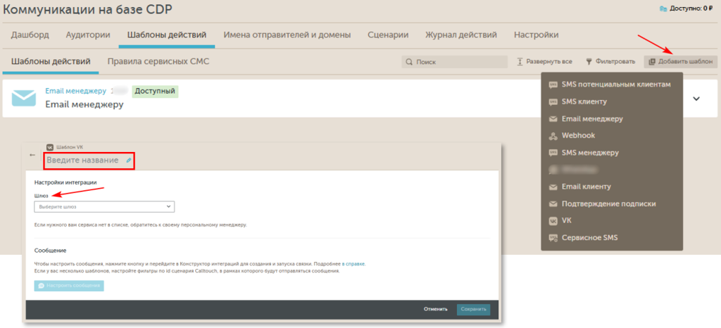 CDP выберите вкладку "Шаблоны действий" => из выпадающего списка нажмите на шаблон "VK" / "Viber".