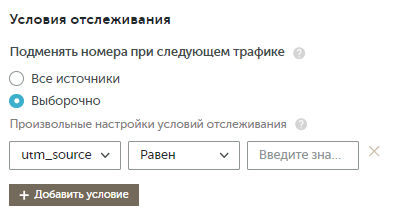 Мы рекомендуем отслеживать динамическим пулом все источники трафика на сайт, для этого оставьте значение по умолчанию в настройках условий отслеживания:
