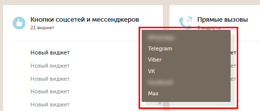 Для групп виджетов, в которых можно создать разные типы виджетов (Кнопки соцсетей и мессенджеры, Прозвон лид-форм), при клике открывается список доступных типов виджетов:
