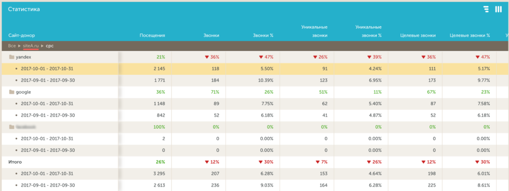 - В истории посещений журнала звонков siteB.ru увидеть первоначальное посещение с сайта siteA.ru;