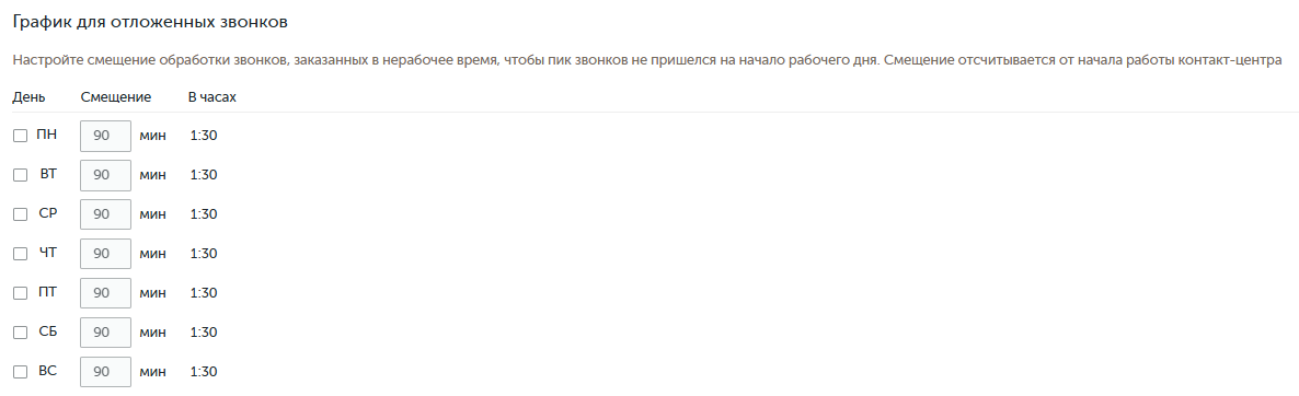 Вы можете настроить смещение времени обработки звонков, оставленных в нерабочее время. График отложенных звонков взаимосвязан с расписанием работы контакт-центра и смещение отсчитывается от времени начала работы контакт-центра. Например, контакт-центр работает с 9-00, смещение настроено на 45 минут, обработка заявок, оставленных в нерабочее время, начнется в 09-45. Если день является нерабочим, выбранное по нему смещение будет игнорироваться.