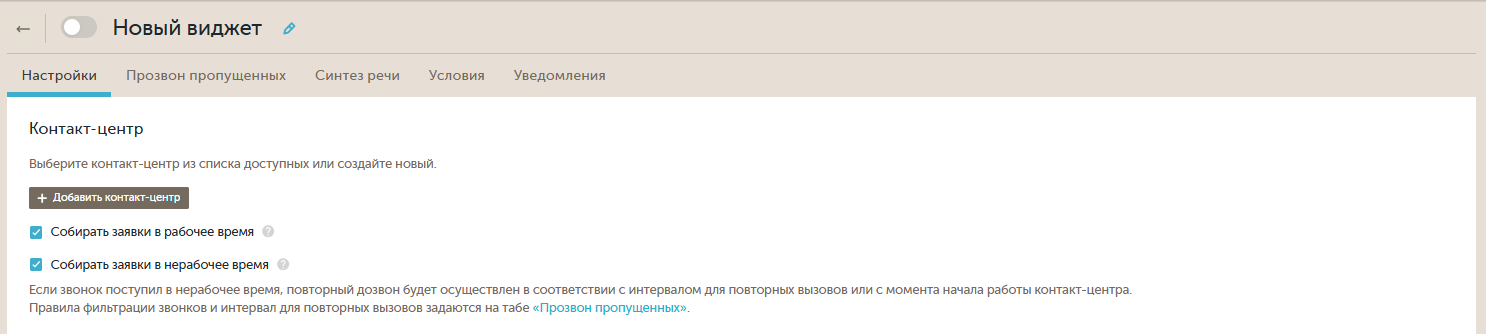 Обязательной настройкой работы виджета является выбор контакт-центра или настройка нового.