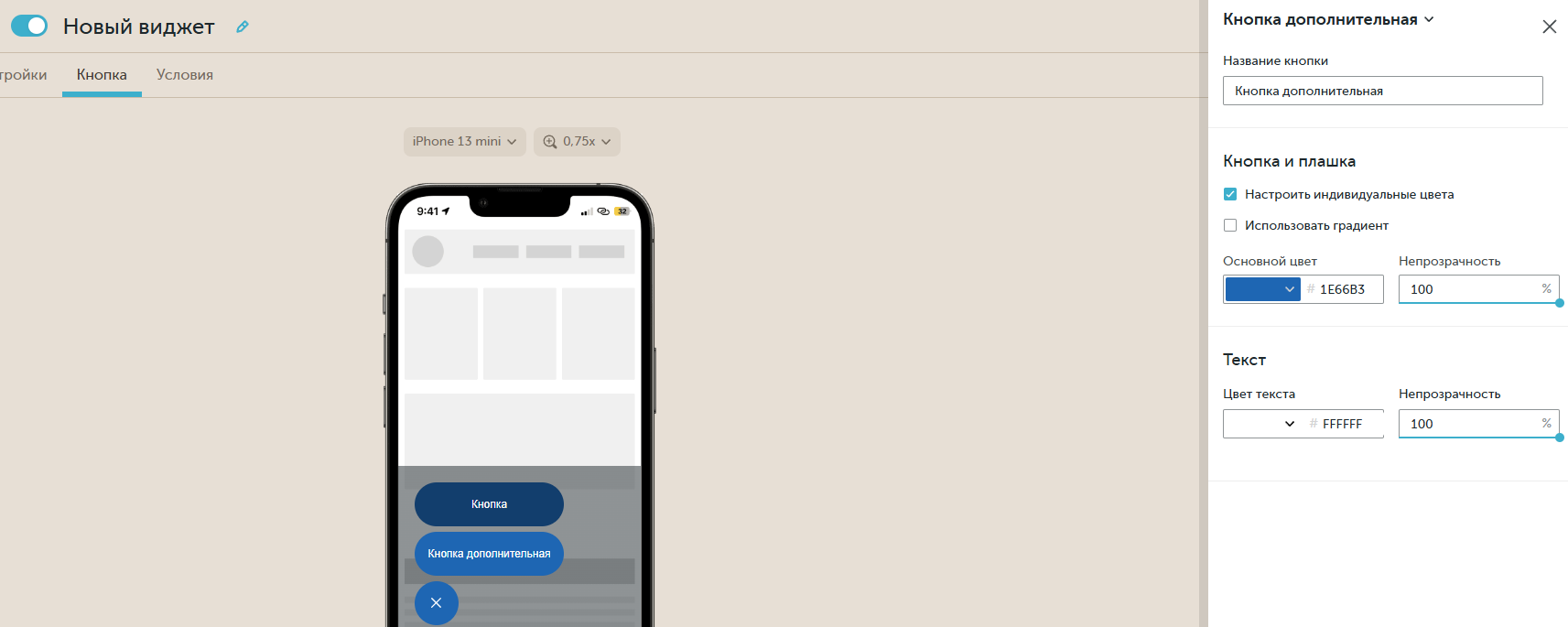 - Если виджет является частью мультикнопки, то он наследует внешний вид, настройки анимации и позиционирования самой мультикнопки. Настройки, заданные в виджете, на момент показа в мультикнопке, будут игнорироваться!