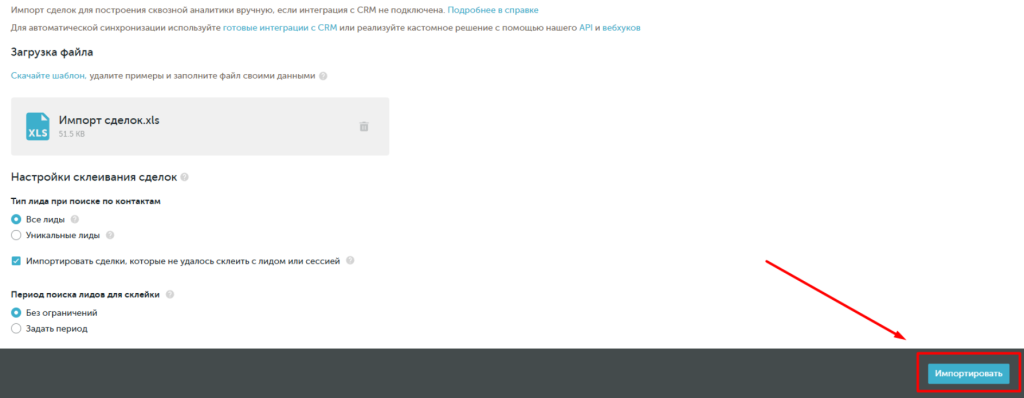 По умолчанию включена настройка «Импортировать сделки, которые не удалось склеить с лидом или сессией». При необходимости её можно отключить.