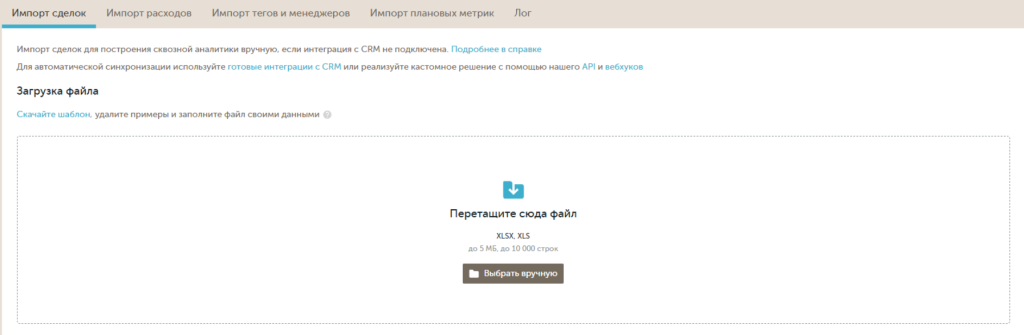 После перехода в раздел Импорт данных откроется вкладка Импорт сделок. Здесь вы можете вручную загрузить список сделок из вашей CRM или другой системы в формате XLS или XLSX.