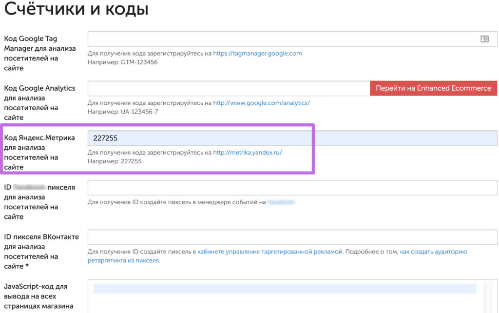 Внимание! Если не вставить код в это поле, то не будет собираться информация об оформленных заказах со страницы «Информация о заказе»