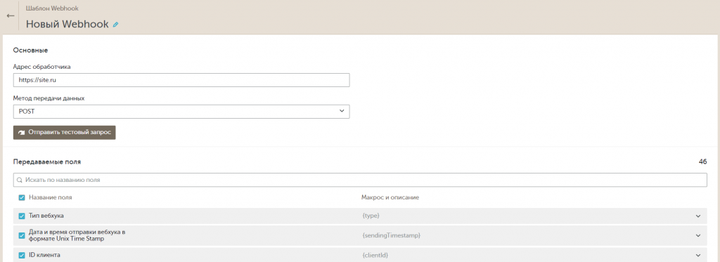 Передаваемые поля. Выберите параметры, которые нужны вам для работы с клиентом. Список параметров описан в Действие «Webhook».