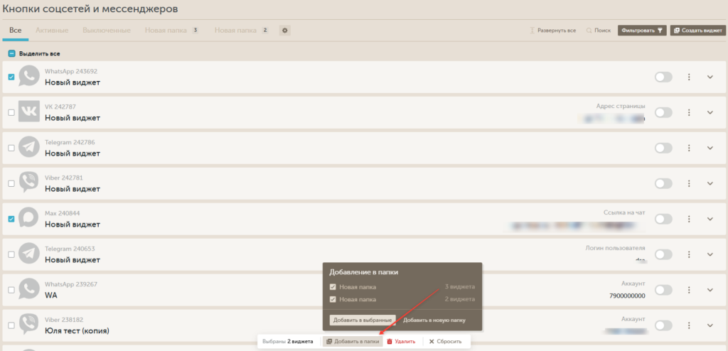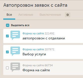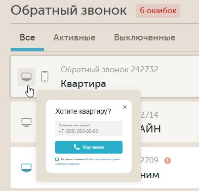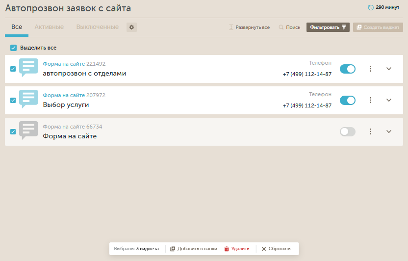 Чтобы активировать или деактивировать определенный виджет обратного звонка, воспользуйтесь переключателем