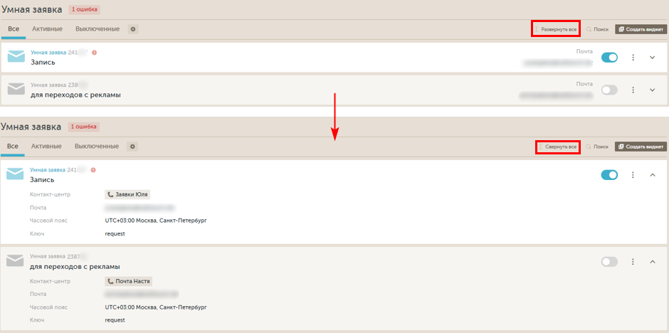 Кнопки "Свернуть все" и "Развернуть все" позволяют выполнять групповые операции со списком виджетов. Кнопка будет удобна, если необходимо зрительно увидеть информацию, которая доступна в развернутой плашке, либо наоборот, если необходимо оценивать список виджетов и не нужно видеть много информации.